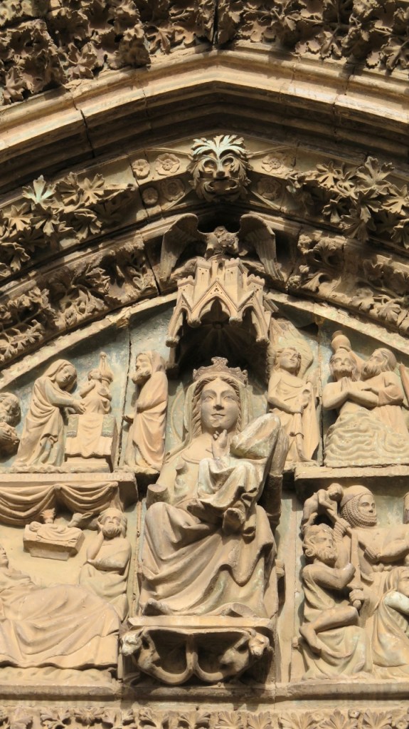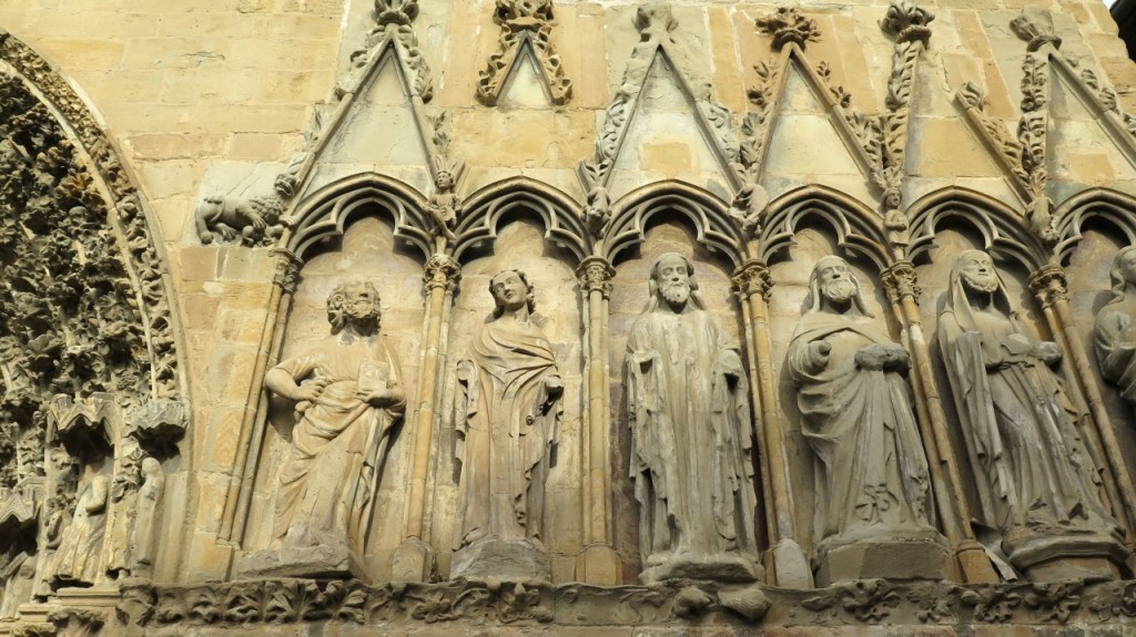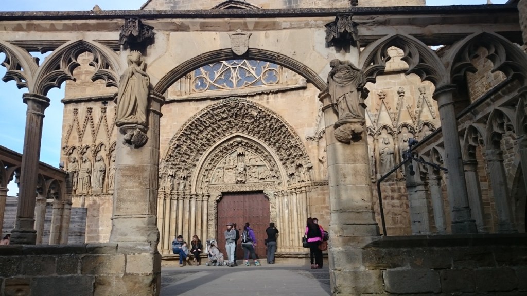 La iglesia de Santa María se levanta entre los dos palacios. Inicialmente fue capilla real, dependiente de la iglesia parroquial de San Pedro. Se empezó a construir en el siglo XIII en una mezcla de estilos cisterciense y gótico para inclinarse definitivamente en el gótico. La fachada principal se acabó en el año 1300 y toma el modelo de la catedral de Notre Dame de París. El arco ojival de la portada está flanqueado por un friso formado por los doce apóstoles. Preside el arco una Virgen con Niño, rodeada por pasajes de la vida de Jesús, nacimiento, matanza de los inocentes, huida a Egipto y bautismo. Sobre este arco ojival se abre un segundo que contiene un gran rosetón y dos pequeños para adaptarse al arco. El atrio se añadió en el siglo XV con un arco de acceso y esculturas de la Virgen con Niño y de Blanca de Navarra. Aprovechando el cuerpo de un torreón romano, también en el siglo XV se construyó la torre y campanario.