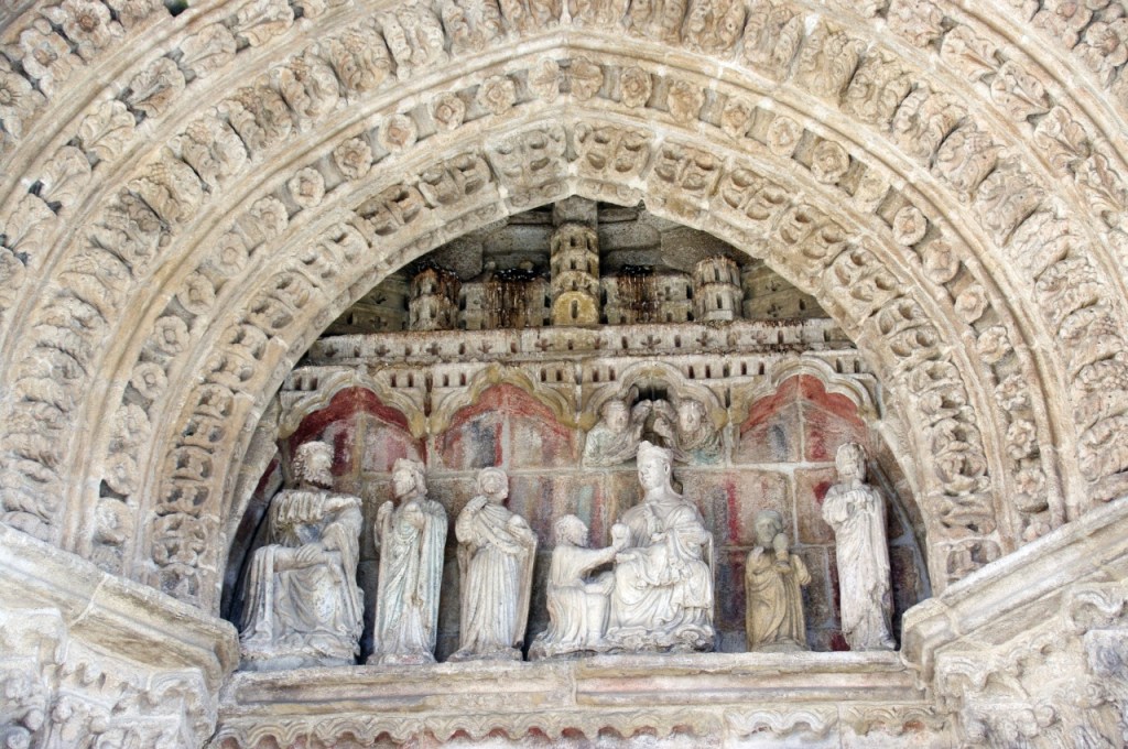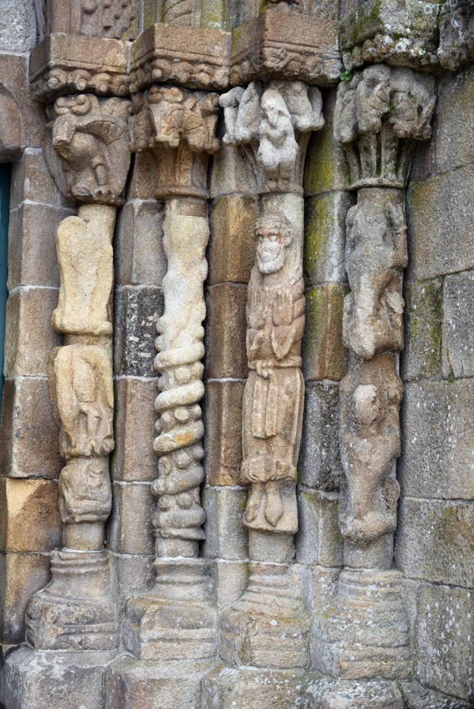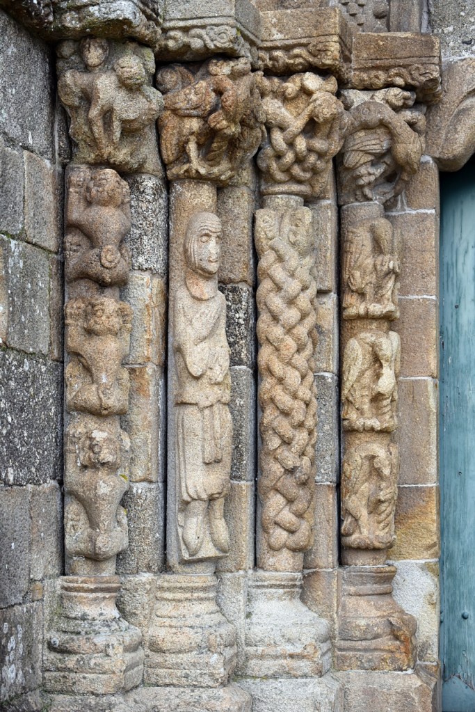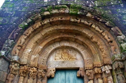 La puerta a poniente justifica el viaje y la lluvia que estamos soportando. Tiene cinco arquivoltas de medio punto, la primera decorada con ajedrezado, la segunda, sogueado y las tres exteriores totalmente figuradas con personas, leones y aves, sucesivamente, rematada con guardapolvos floreado.