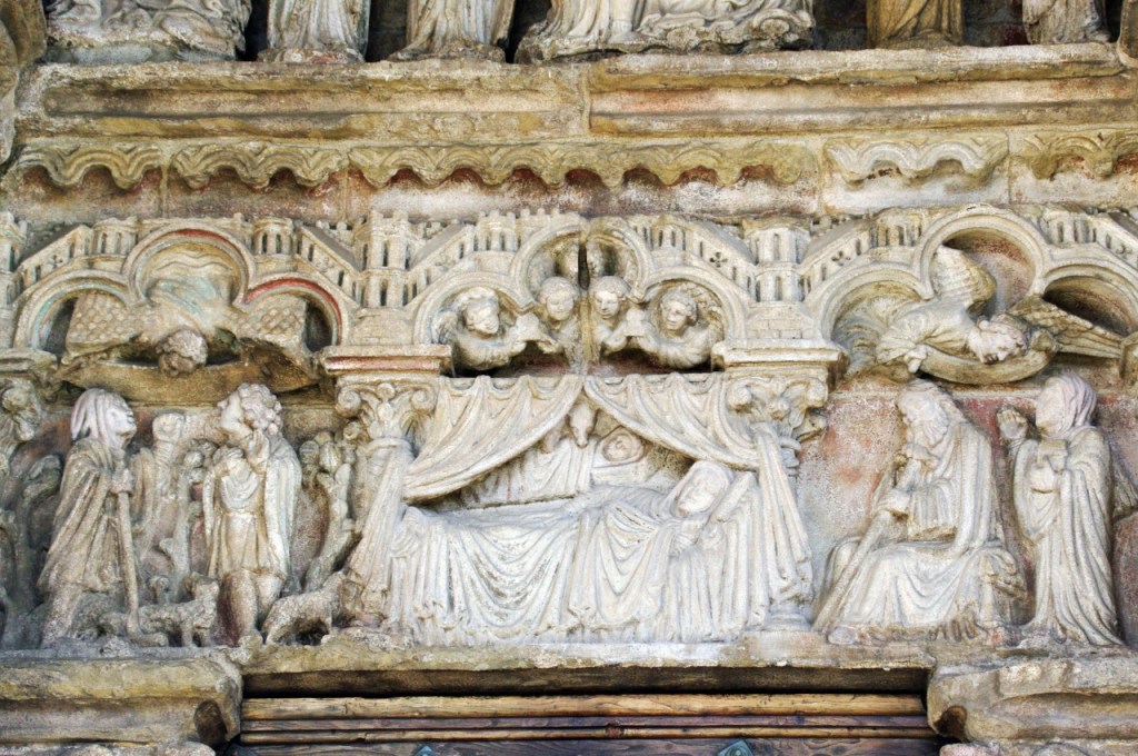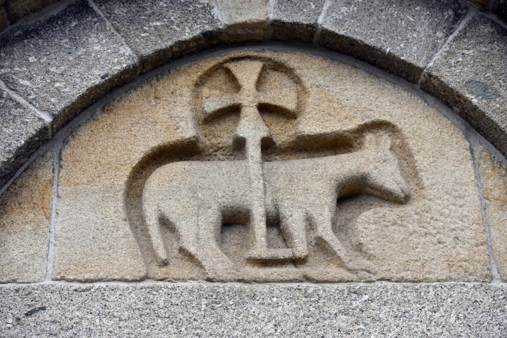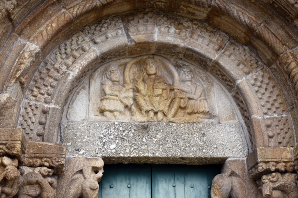 El dintel muestra un Cristo en Majestad en mandorla flanqueada por dos ángeles. En las mochetas, dos cabezas de bóvidos.