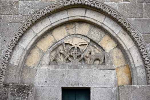 La fábrica es de una sola nave, de cabecera rectangular, tan frecuente en el románico luso y gallego, con un hermoso rosetón en el muro a levante. El ábside es más estrecho y bajo que la nave, austero, con solo unas aspilleras de iluminación, canecillos geométricos y moldura ajedrezada en el alero. En el muro norte se ha añadido una sacristía. En un rincón descansan dos sarcófagos antropomorfos. No encontramos a nadie que pudiera abrirnos la iglesia así que hubimos de conformarnos con contemplar sus muros exteriores, singularmente sus tres puertas, a cual más interesante.