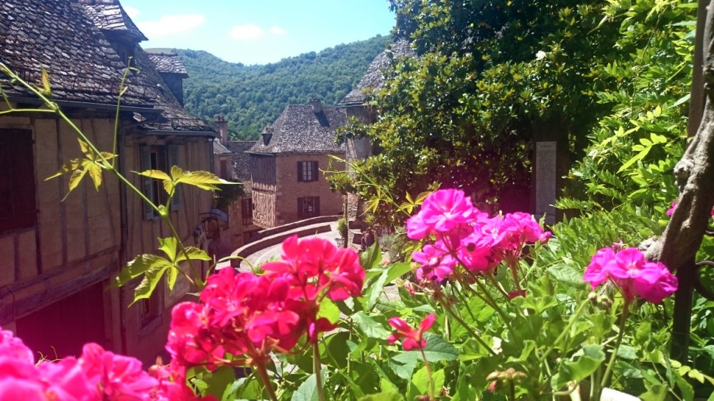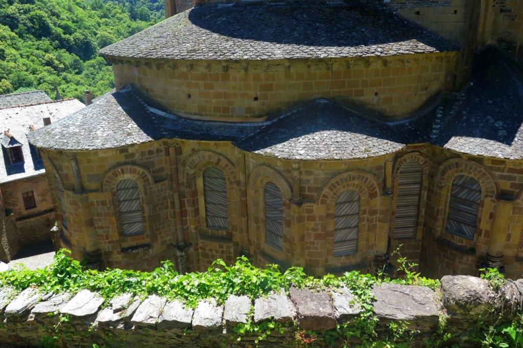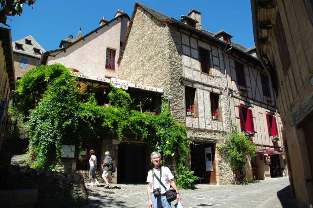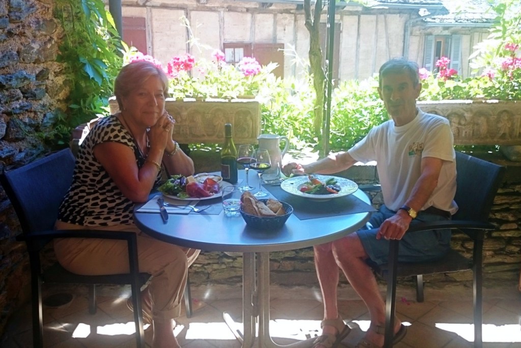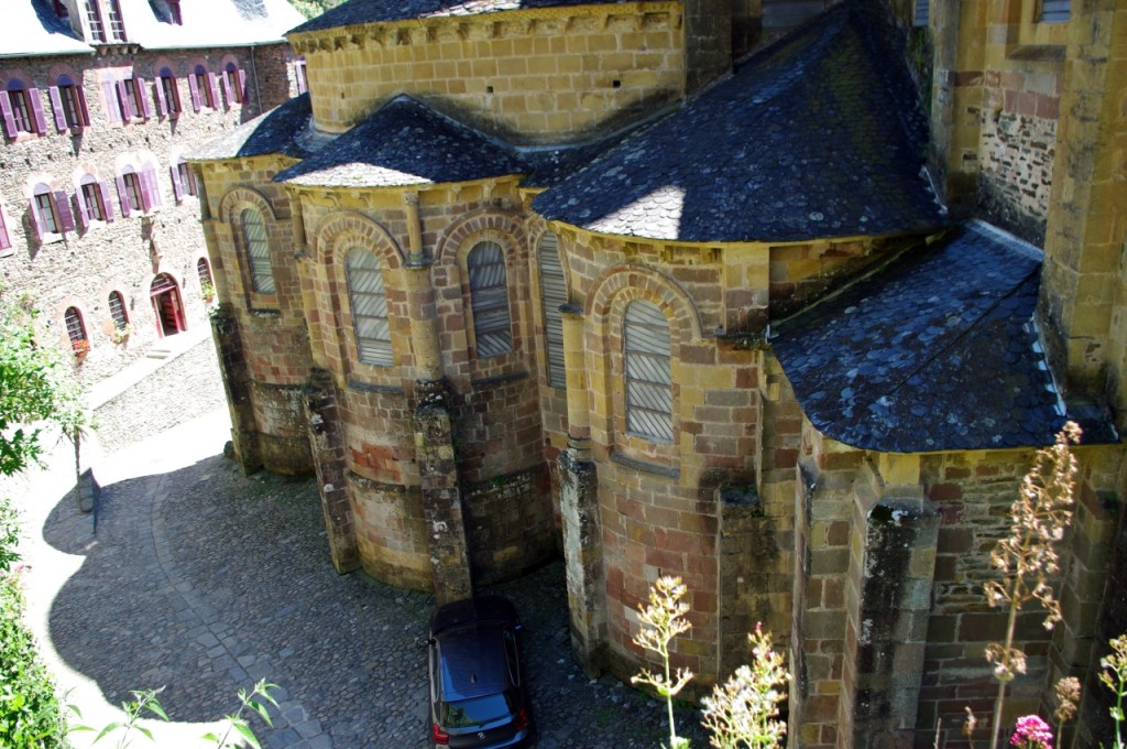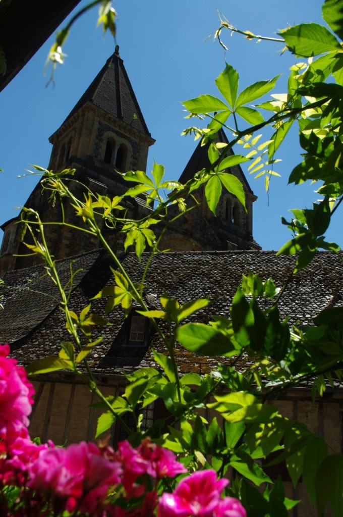 Como además del espíritu conviene alimentar el cuerpo, elegimos para comer un lugar a la altura del entorno: la terraza del restaurante del hotel Saint Foy, que resulta ser un remanso de paz. El Colega recordará para siempre la carne de vaca aubriac guisada al vino que comió allí. Los dos recordamos el ambiente de paz, la amabilidad del personal, la terraza umbría, con las torres de la abadía por encima de las flores de la jardinera. Un lugar pleno de belleza, donde no se siente el discurrir del tiempo.