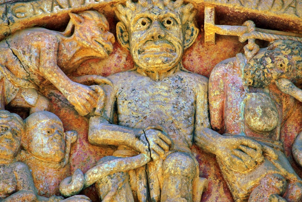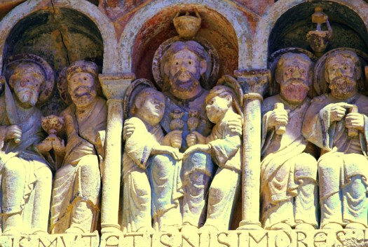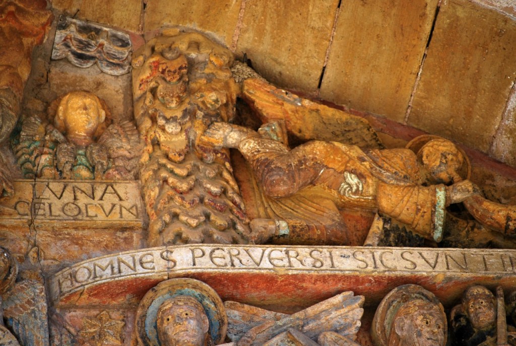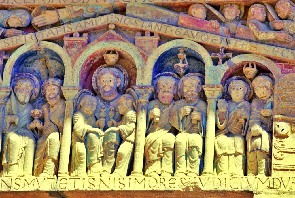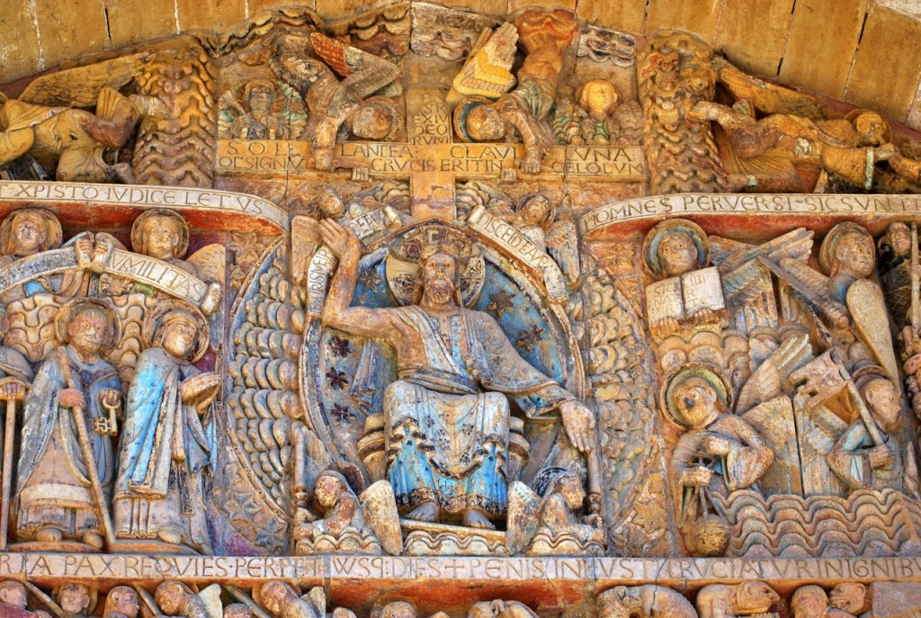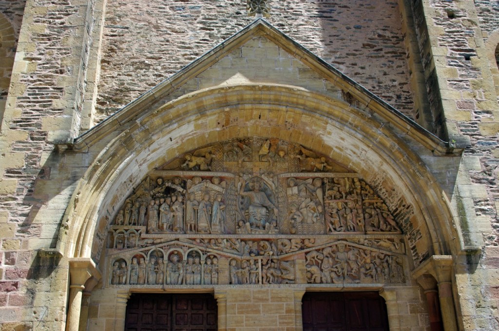 Nosotros llegamos a Conques deseosos de contemplar el tímpano policromado, que se abre en la parte occidental de la abadía. Representa el Juicio final según el Evangelio de San Mateo, labrado en piedra, en los que se distinguen 124 personajes, veinte compartimentos, los justos por un lado, los condenados por otro. Una de las obras fundamentales de la escultura románica en Francia, tanto por sus cualidades artísticas como por sus dimensiones -el frontón tiene 6,70 metros de anchura- y originalidad.
