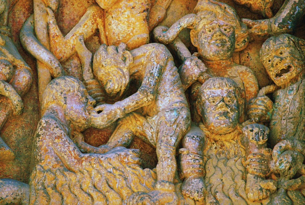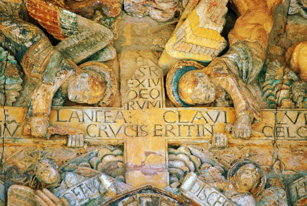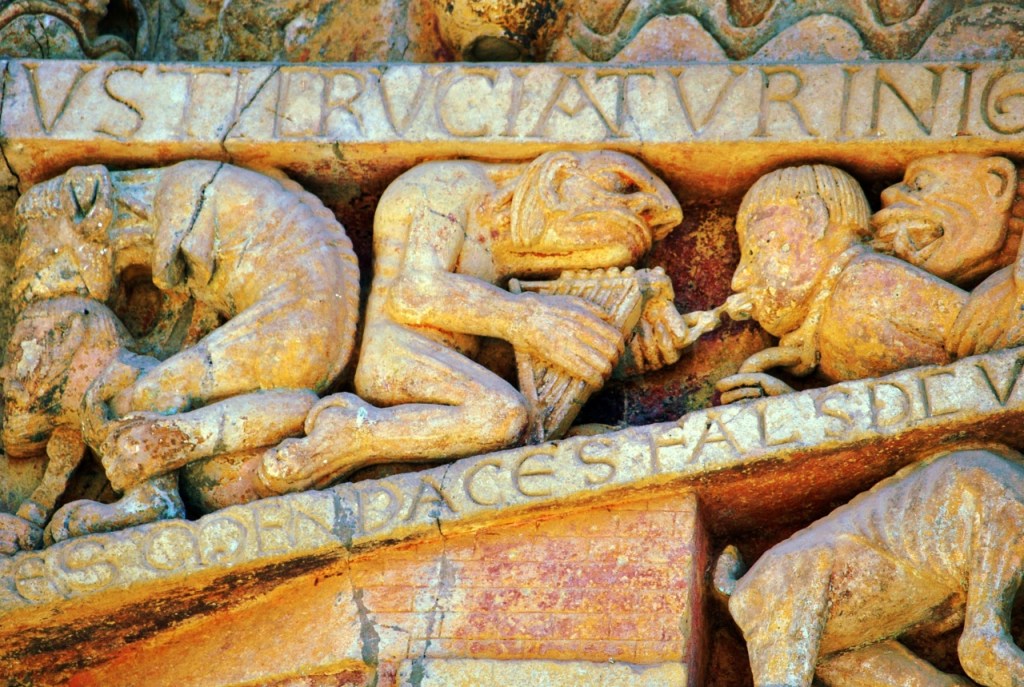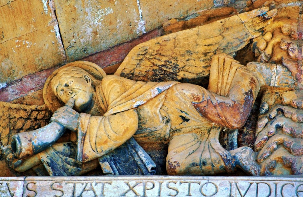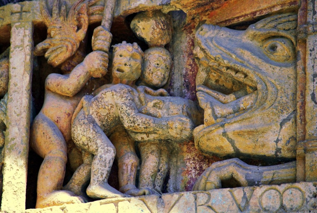 Nosotros llegamos a Conques deseosos de contemplar el tímpano policromado, que se abre en la parte occidental de la abadía. Representa el Juicio final según el Evangelio de San Mateo, labrado en piedra, en los que se distinguen 124 personajes, veinte compartimentos, los justos por un lado, los condenados por otro. Una de las obras fundamentales de la escultura románica en Francia, tanto por sus cualidades artísticas como por sus dimensiones -el frontón tiene 6,70 metros de anchura- y originalidad.