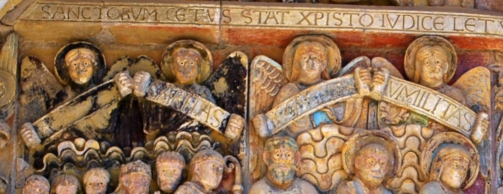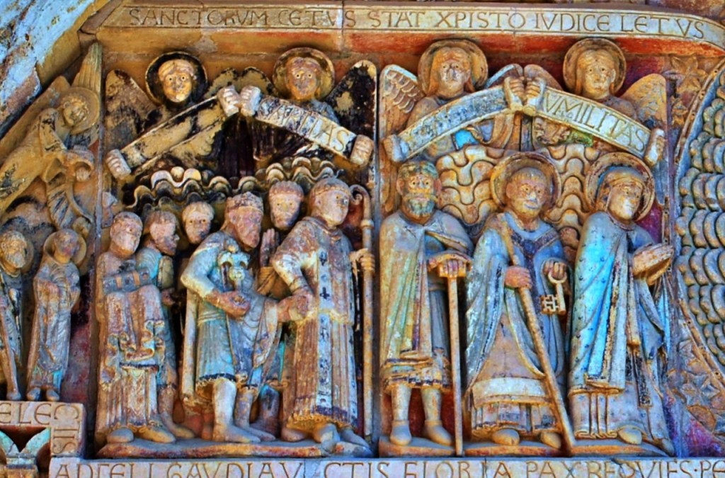 En el centro, Cristo en Majestad. Entre las figuras se reconoce a la Virgen María, a San Pedro, a Abraham, al abad fundador y a Carlomagno, a Santa Fe y a los prisioneros a los que ha liberado, pero también a los monjes indignos, a un borracho, y los pecados capitales. «Pecadores, si no cambiáis vuestras costumbres, sabed que sufriréis un juicio temible”, advierte una leyenda. El catecismo en piedra al alcance de todos los públicos.