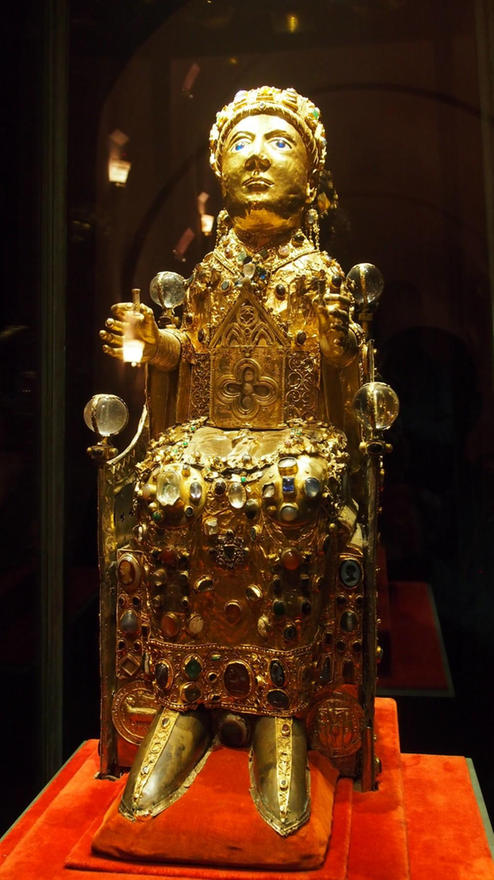 Los visitantes pueden contemplar este tesoro en una sala especialmente habilitada en la galería sur del claustro. Compuesto por relicarios, destaca, entre todas las valiosas piezas, la llamada “majestad” de Santa Fe, datada entre los siglos IX y X. Se trata del cráneo de la santa alojado en una estatua de madera, oro, plata y gemas, convertido en objeto preciado de veneración. Está considerado uno de los cinco tesoros de orfebrería medieval más importantes de Europa y el único en Francia que reúne tantos objetos de la alta Edad Media.