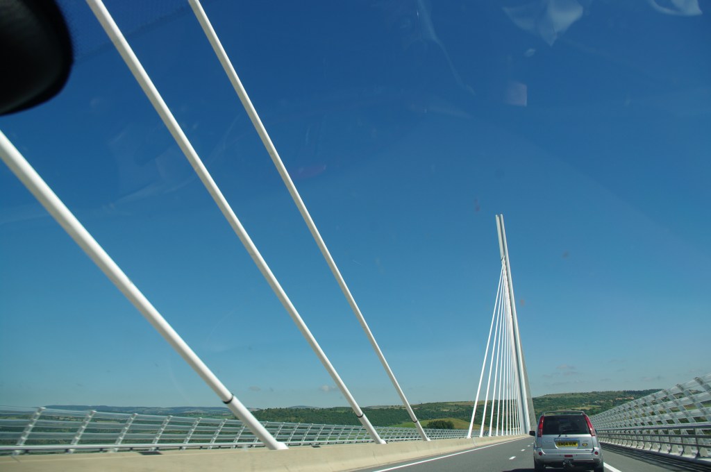 Hemos salido de Arles, tomamos la A-54 hacia Nimes y allí, la A-9, autopista saturada de tráfico entre España y Europa. Pensamos salir de la A-9 en Montpellier y coger la A-75 en dirección al viaducto de Millau, pero nos pasamos de salida y tenemos que llegar hasta la de Béziers, que pasa por Sète, lugar de nacimiento de Paul Valery y de Georges Brassens, un sembrado de bateas que anotamos para futuros viajes.