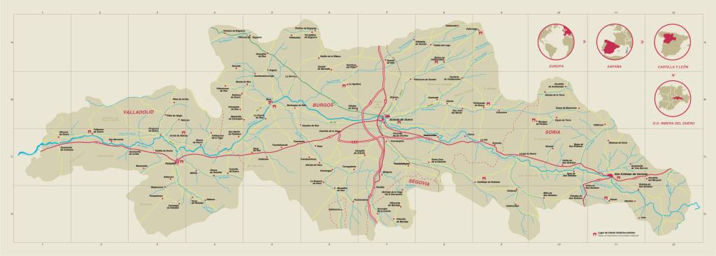 Desde el punto de vista vitivinícola, la Ribera del Duero se extiende por cuatro provincias -Soria, Burgos, Segovia y Valladolid- y por seis Comunidades de Villa y Tierra: Curiel, Peñafiel, Roa, Aza, Montejo y San Esteban. En una extensión de 26.123 hectáreas atravesadas de este a oeste por la carretera N-122 que algún día será la A-11 -si los dioses lo permiten-, por la autovía A-1 de norte a sur y en cualquier dirección por una red de carreteras comarcales y locales se concentra una comarca esplendorosa desde el punto de vista económico.