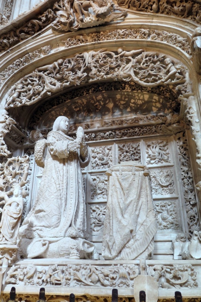 La Cartuja de Miraflores 👇está situada en el parque de Fuentes Blancas, a unos cuatro kilómetros del centro de la ciudad. Es otra de las fundaciones reales, en este caso de los Trastamara. Inicialmente fue pabellón de caza de Enrique III, su hijo Juan II cedió sus terrenos a los monjes para levantar un monasterio, que un incendio destruyó totalmente. En 1454 se inició el nuevo cenobio dirigido por Juan de Colonia y luego, por su hijo, Simón. En 1484, Isabel de Castilla mandó trasladar allí los restos de sus padres, Juan II y su segunda esposa, Isabel de Portugal, y de su hermano Alfonso, muerto en la adolescencia. La silueta de la iglesia recuerda un sarcófago orlado de pináculos a modo de velones.