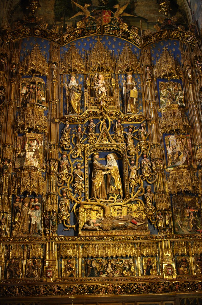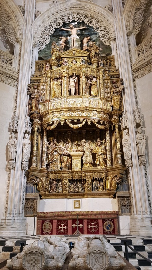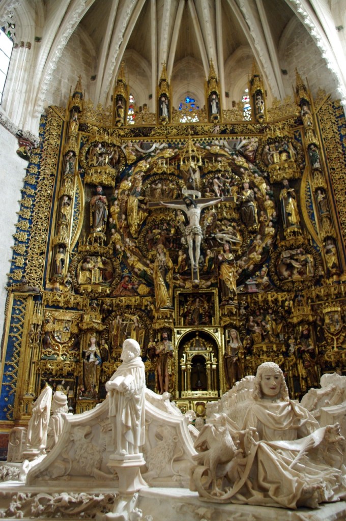 El retablo policromado que preside la iglesia es también obra de Gil de Siloé, dorado por Diego de la Cruz, se dice que con el oro que Colón trajo de América en su segundo viaje. Constituye una exaltación del sacramento de la Eucaristía a la vez que un retrato del reinado de Isabel la Católica, quien mandó traer de Flandes las vidrieras.