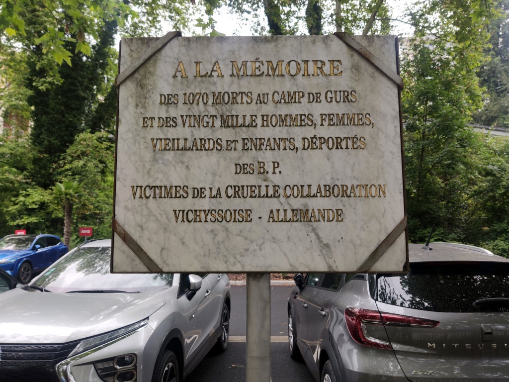 En un jardincillo encontramos un cartel que habla de una etapa política penosa para Francia: la colaboración del gobierno de Vichy, liderado por el mariscal Petain, con las fuerzas alemanas de Hitler. «A la memoria de los 1070 muertos en el Campo de Gurs y de los veinte mil hombres, mujeres, viejos y niños, deportados víctimas de la cruel colaboración Vichy-Alemania«, reza el cartel.