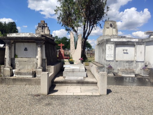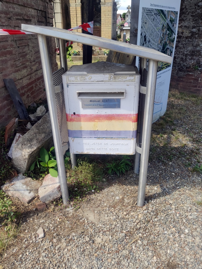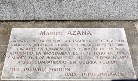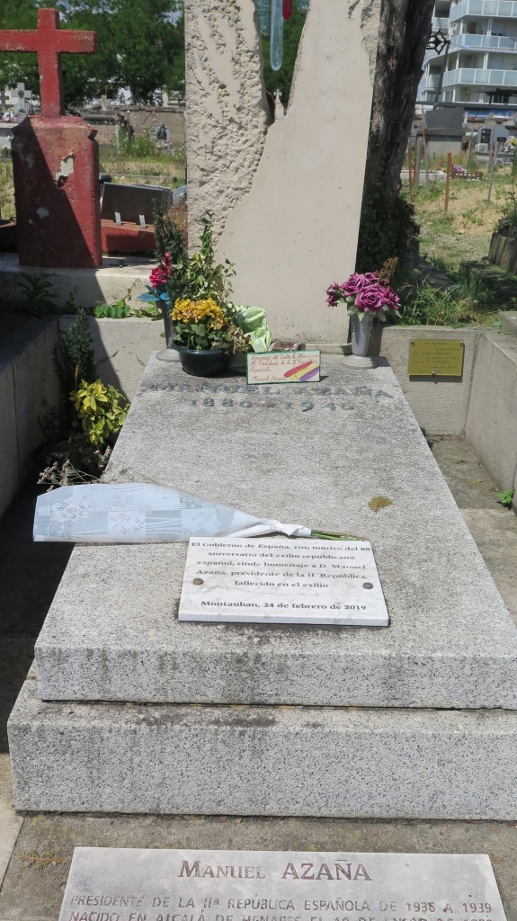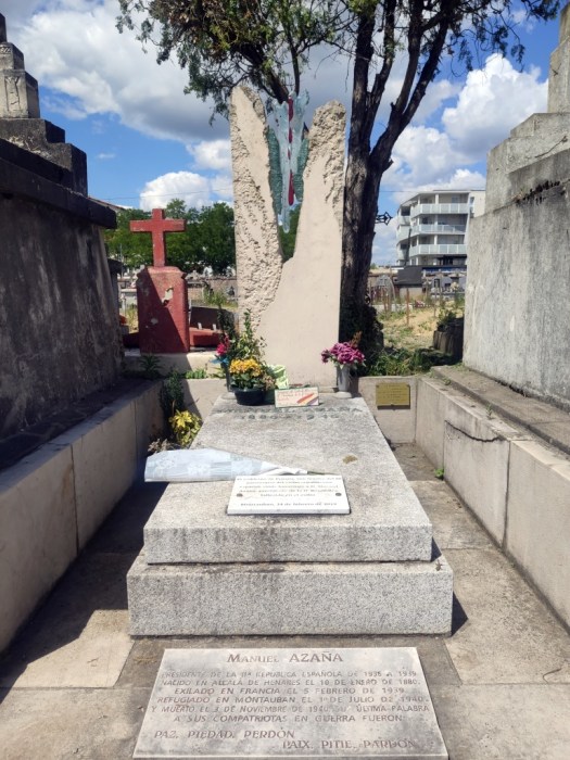 El viaje coincide con mi 77 cumpleaños. Tantas veces siete me hacen pensar que no hay mucho tiempo que perder y que más me vale ir haciendo las cosas que tengo pendientes, como expresar el reconocimiento a quienes pagaron un precio tan alto en su empeño por modernizar España. Como nuestro itinerario románico de este viaje pasaba cerca de Montauban le he propuesto al Colega acercarnos a visitar la tumba y rendir homenaje al ilustre jurista, literato y político que fue don Manuel Azaña, presidente de la segunda República, cuya memoria ha sido insultada y maltratada. Nos dirigimos, pues, al cementerio viejo. Llevamos el plano del lugar donde se encuentra su tumba pero el Colega, que no pierde ocasión de confraternizar con los franceses, se dirige al edificio de entrada del camposanto donde a la primera frase, el señor que le atiende, en un castellano tan macarrónico como el francés suyo, le acompaña a un rincón cercano donde hay un buzón en el que los visitantes dejan sus cartas y un cartel referidos a Azaña. En cuanto le he oído he sabido adonde venía, dice. La tumba se encuentra en el trapeze Q, section 7. Así y todo, nos cuesta encontrarla, algo constreñida entre los mausoleos de las familias Matignon y Gaubert.