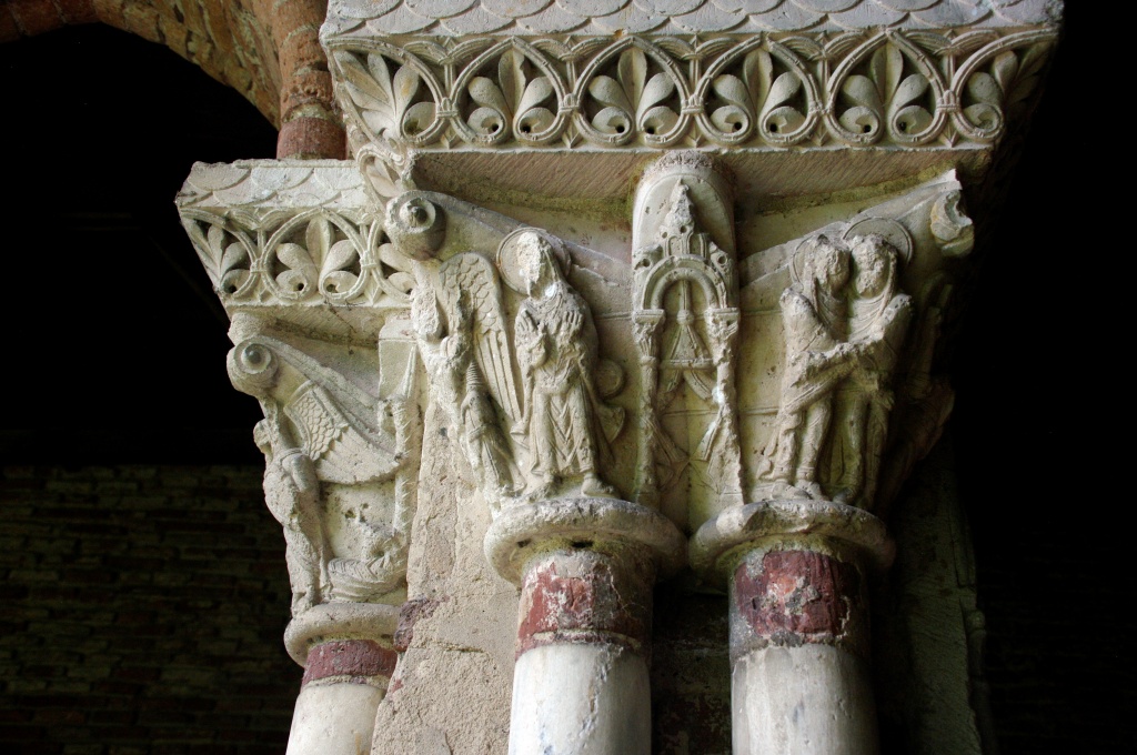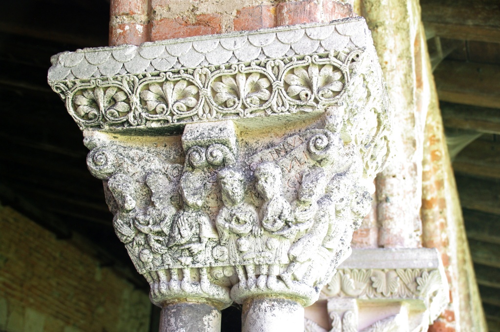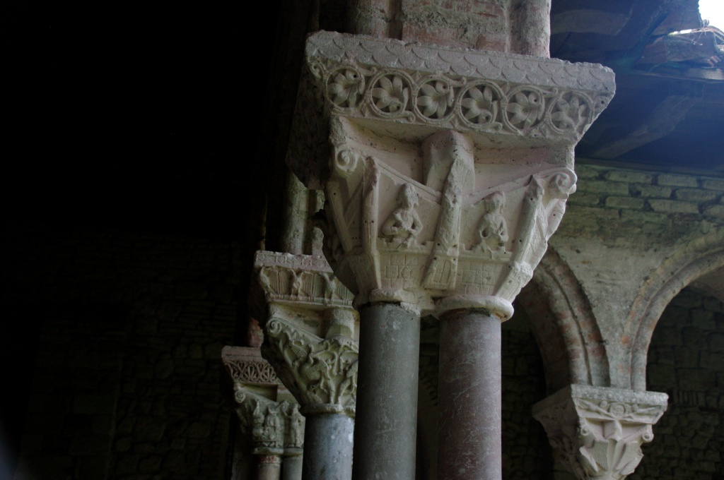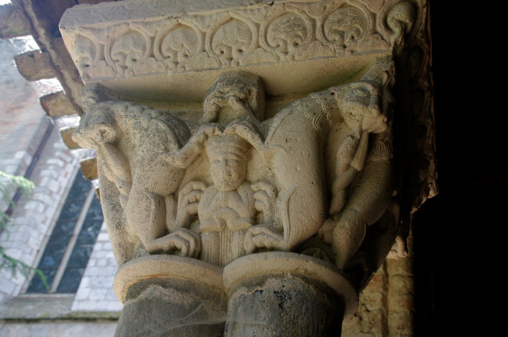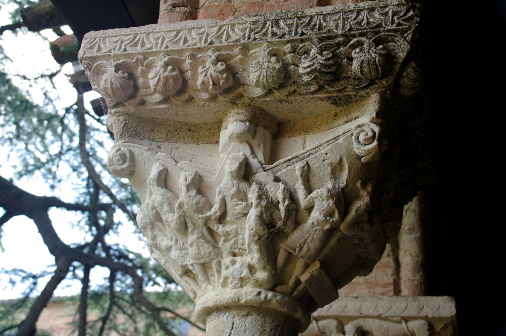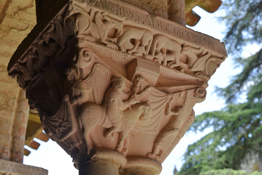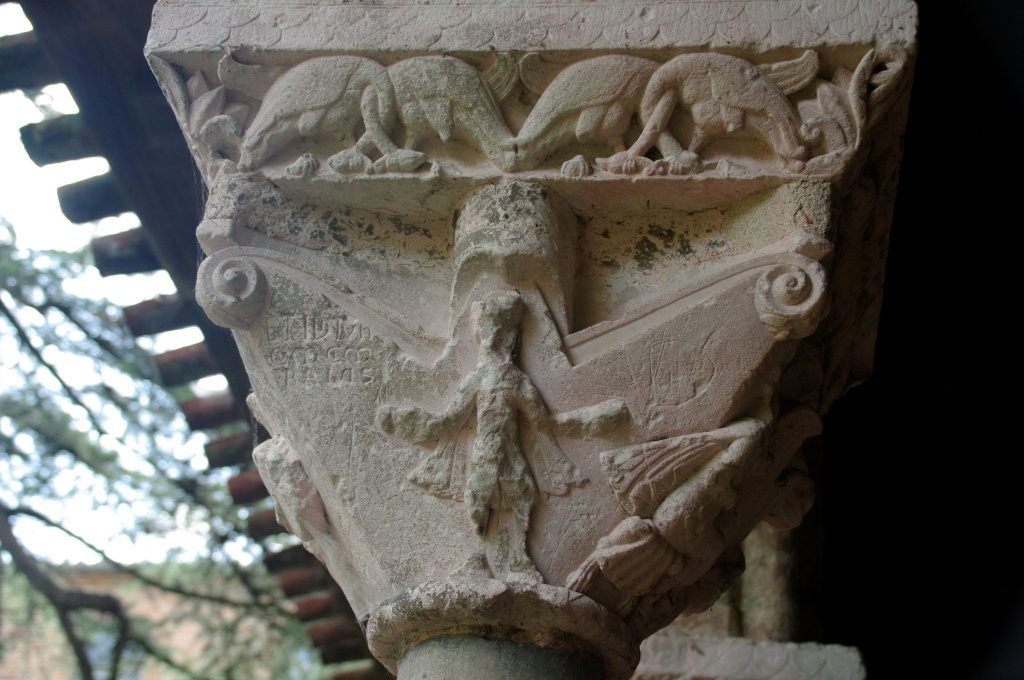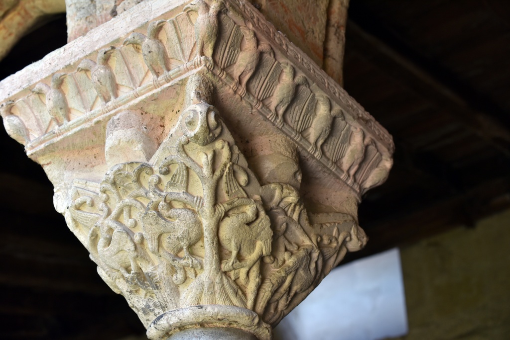 Han dispuesto también otro acceso al claustro, del siglo XI, más acorde con la importancia del monumento. El claustro reúne 76 capiteles de los que 46 son historiados: pasajes bíblicos del Antiguo y Nuevo Testamento, vidas de santos, representaciones vegetales y zoomorfas. Todo el repertorio románico distribuido en las cuatro pandas del claustro: Adán y Eva, Caín y Abel, Daniel en el foso de los leones, Sansón desquijarando al león, las bodas de Canáa, la decapitación del Bautista, la samaritana, San Esteban, San Lorenzo, San Martín de Tours, aves, leones, grifos, dragones…
