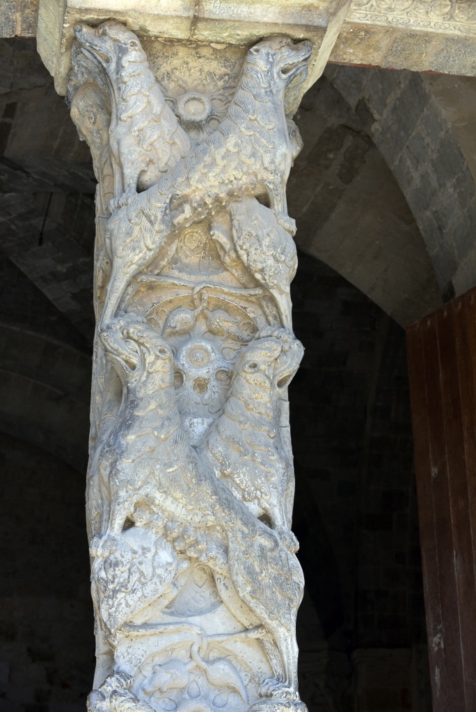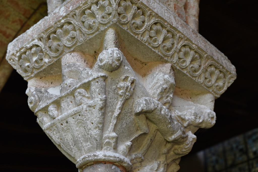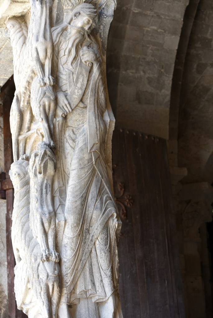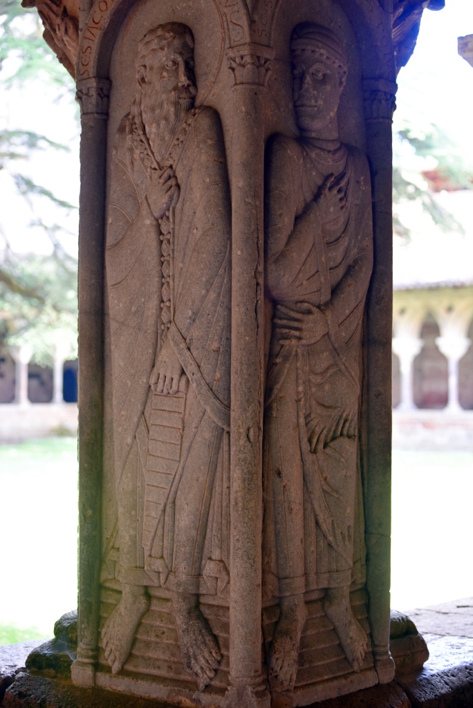 En pilares ubicados en las cuatro esquinas y en el centro de las pandas, los apóstoles San Pedro, San Pablo, San Juan, Santiago, San Felipe, San Andrés, San Bartolomé, San Mateo, Simón y el abad de Moissac y obispo Durand de Bredons. Los arcos apuntados del claustro corresponden a la reconstrucción del siglo XIII. (Si quieres conocer más de la abadía de Moissac Arteguías te lo cuenta aquí👇)