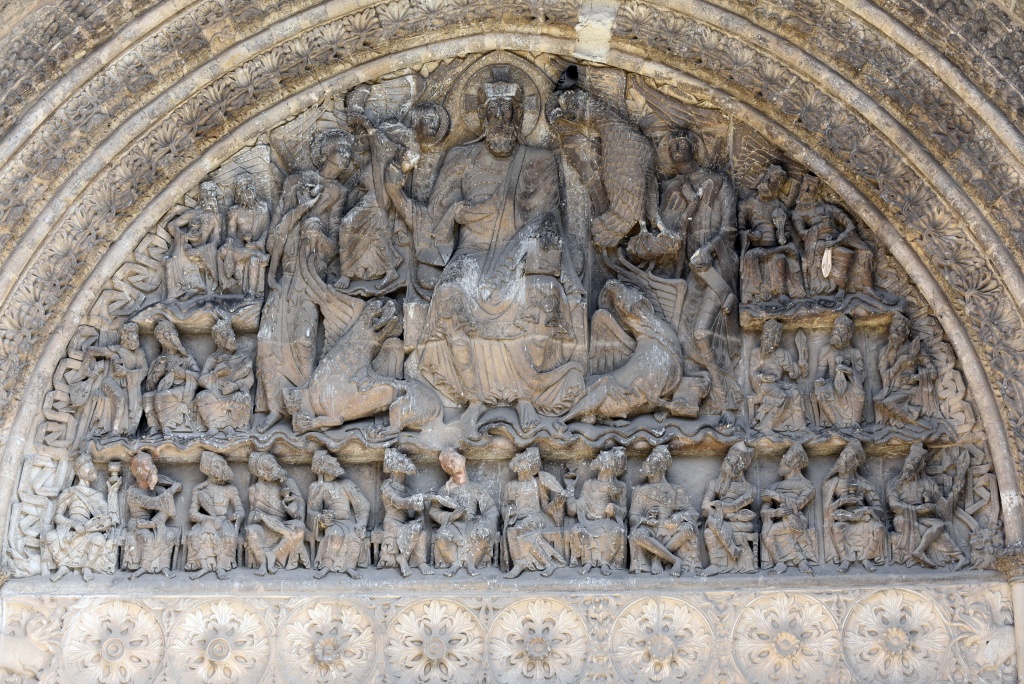 Como es habitual en este tiempo y en las construcciones románicas, aquí se despliega un catecismo para fieles analfabetos. En el tímpano, un Cristo en Majestad, coronado, sentado en el trono, bendiciendo con la mano derecho y sosteniendo el Libro de la Vida en la izquierda. Le rodean los cuatro símbolos del Tetramorfos; abajo y a los lados, los veinticuatro ancianos del Apocalipsis miran a Cristo y portan instrumentos musicales.