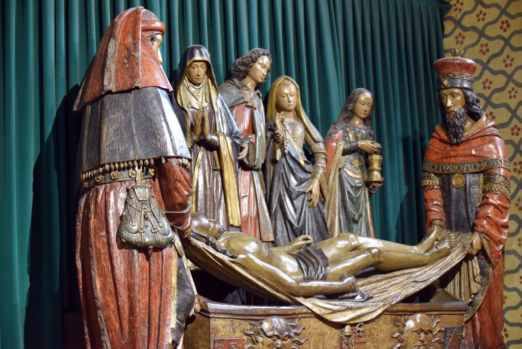 Entramos en la iglesia buscando el grupo escultórico del Santo Entierro del siglo XV, que me gusta especialmente. Tiene también un Cristo románico y un sarcófago paleocristiano.