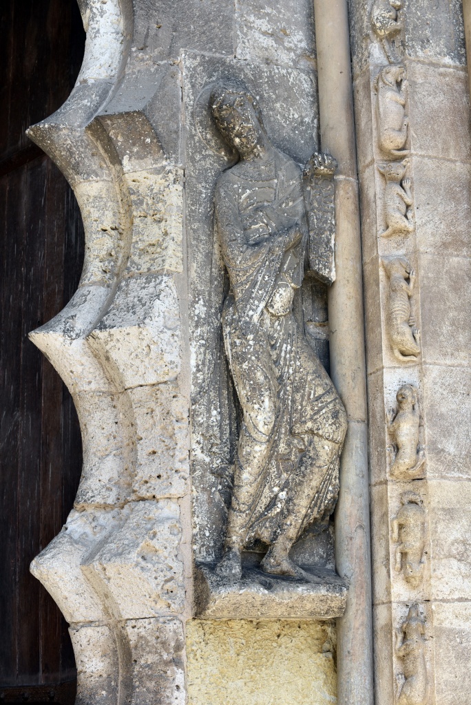 El mainel de la portada lleva relieves de leones entrelazado trepando en su cara frontal. A los lados, San Pablo y Jeremías. Este último es uno de los relieves más hermosos de Moissac.