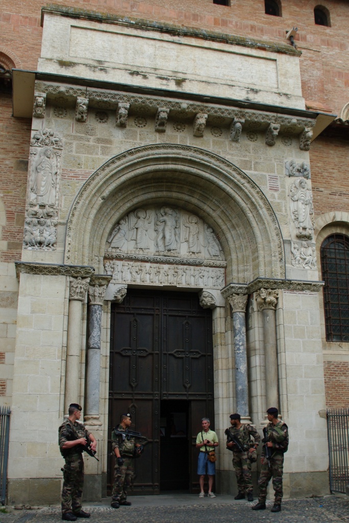 En la puerta de San Sernín había apostados cuatro soldados como cuatro armarios con las armas a punto. Y allí que se fue el Colega a preguntarles por su trabajo y a hablarles del Camino de Santiago y de la importancia del arte. Los soldados le miraban como si fuera un extraterrestre. Yo pensé que me lo encerraban en la comisaría o en el manicomio. Optaron por irse antes de que les diera otra chapa a la salida.