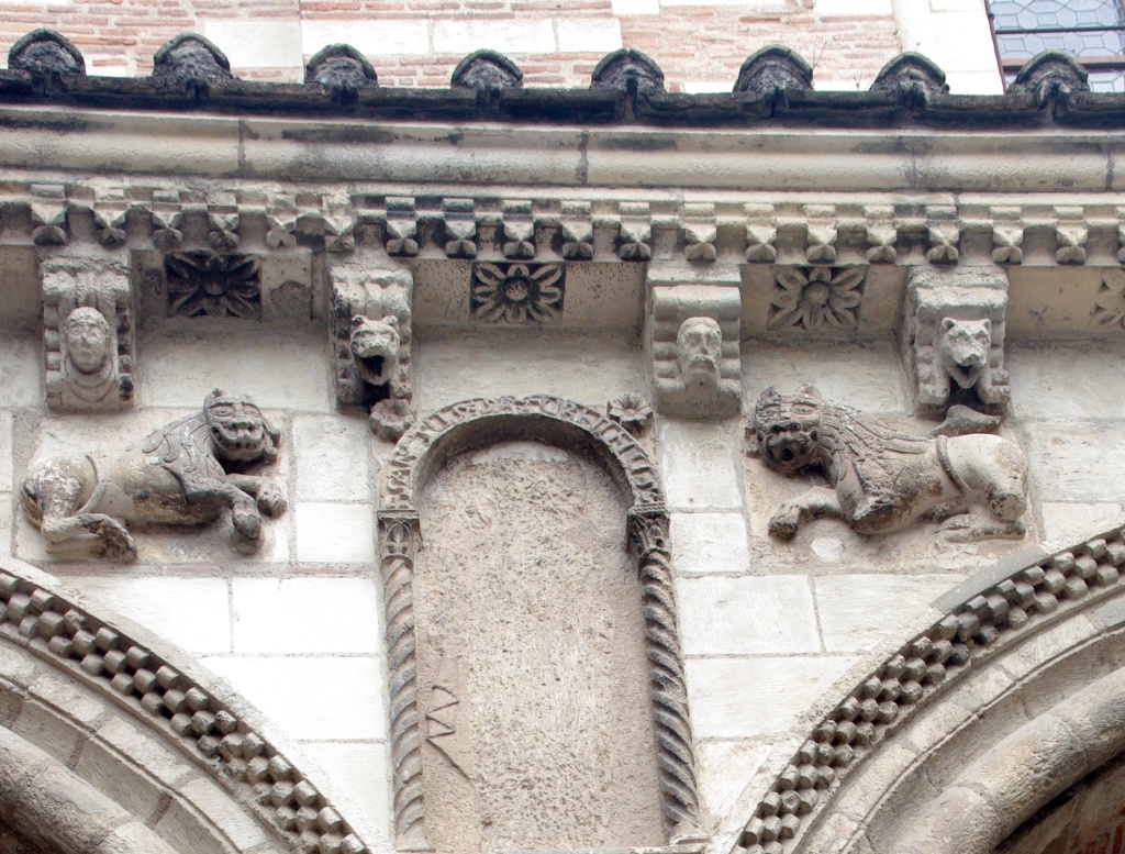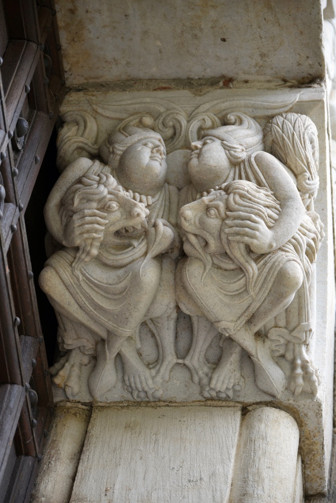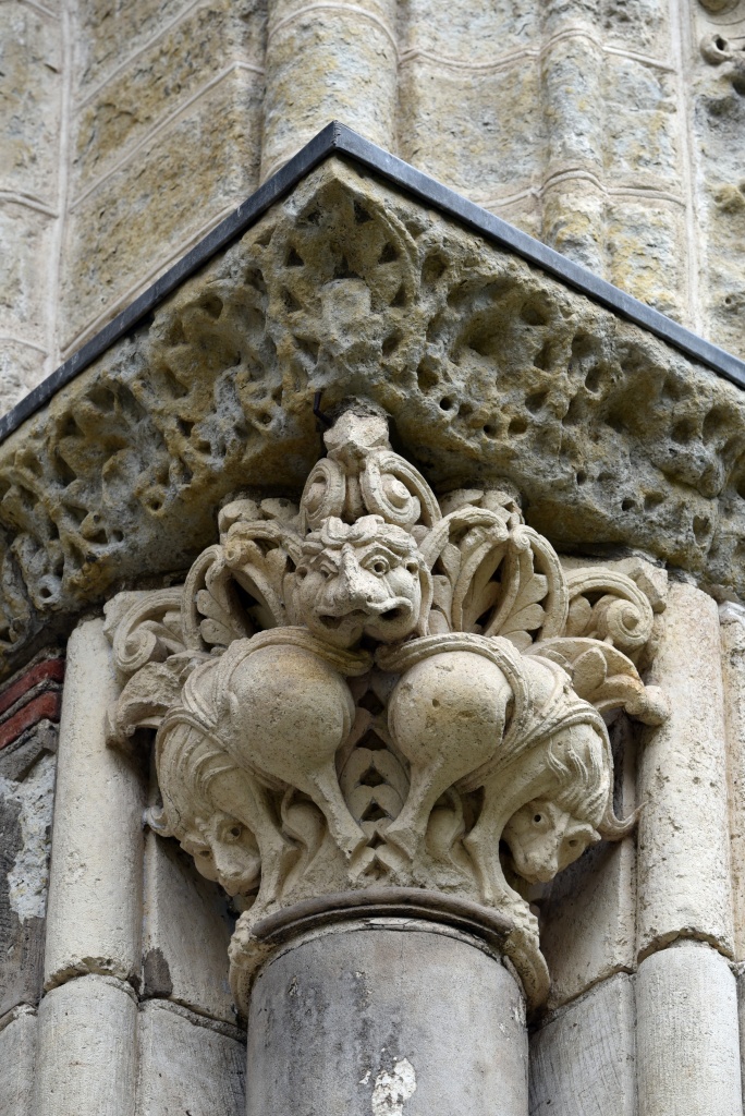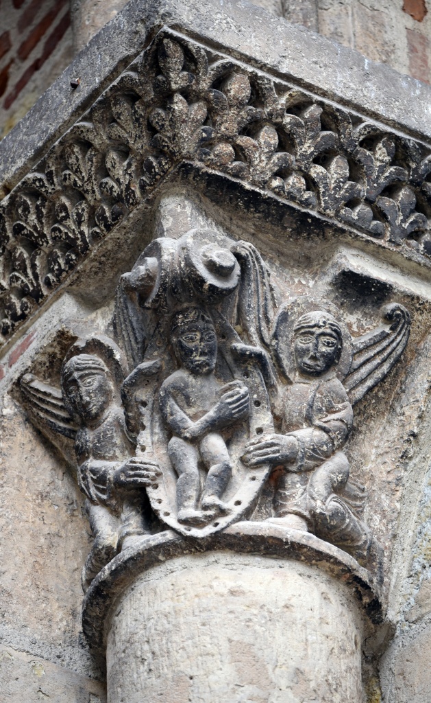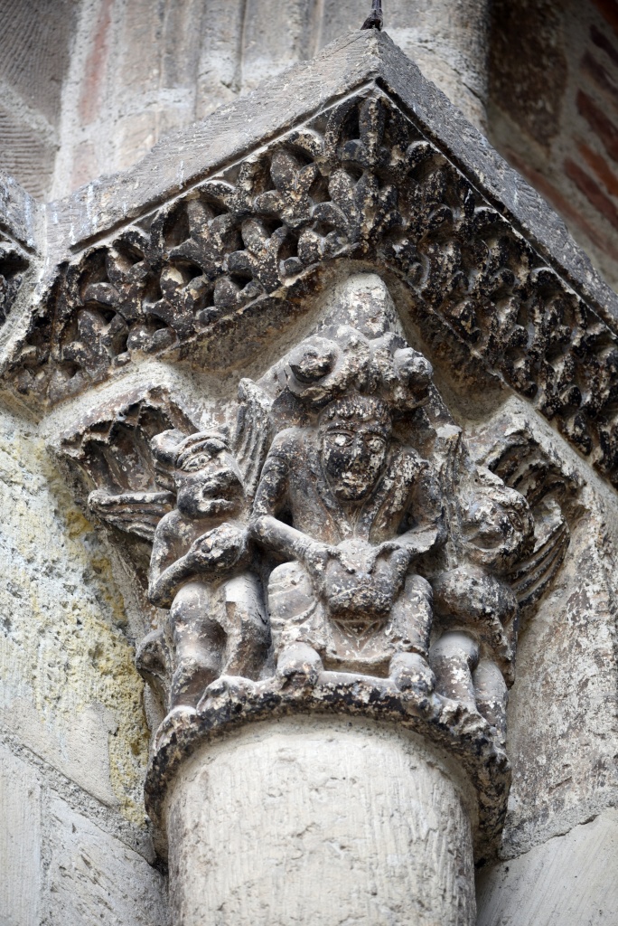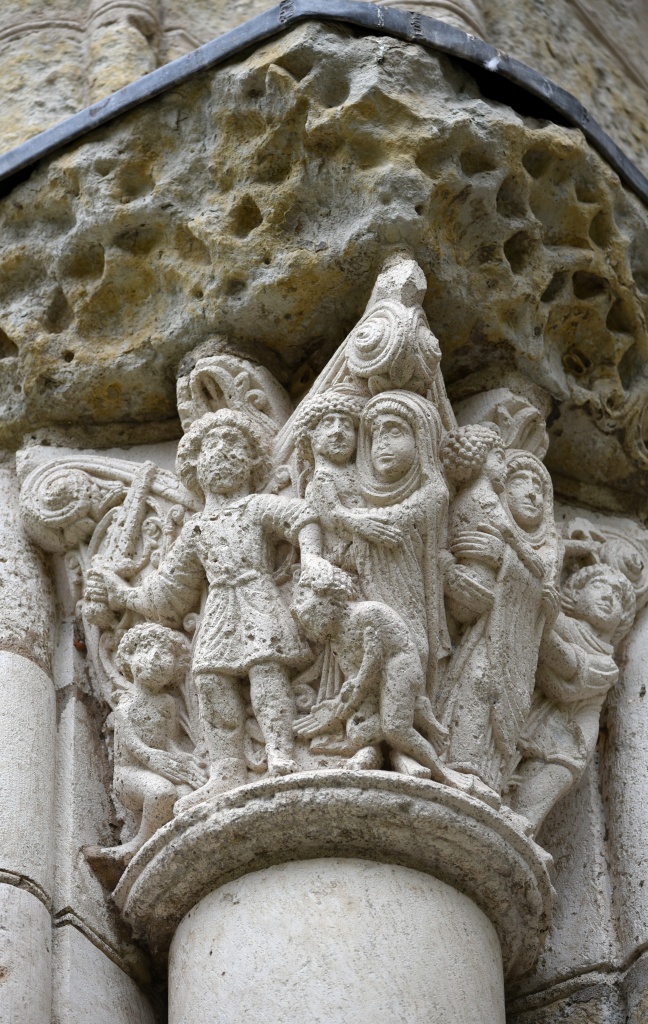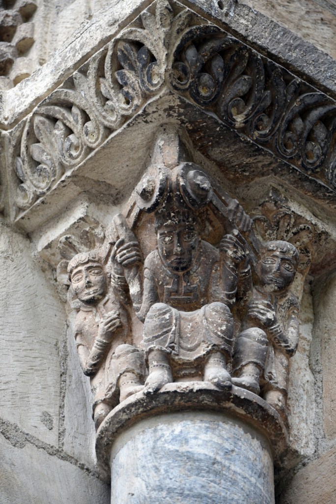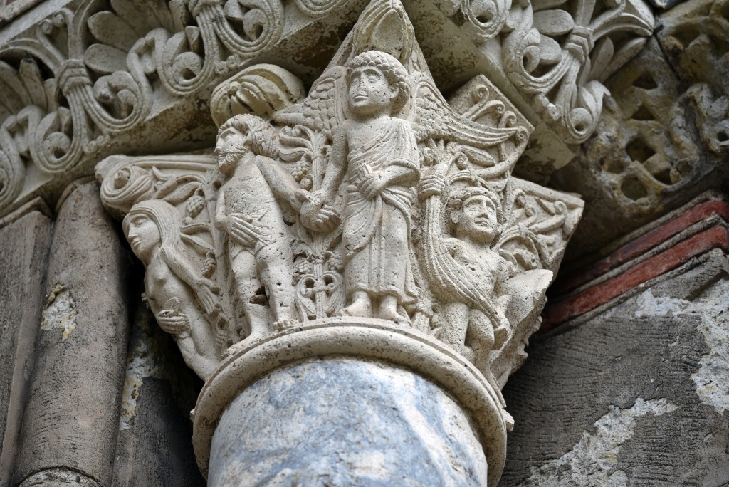 Los capiteles representan escenas bíblicas: la expulsión de Adán y Eva del paraíso, la Anunciación de San Gabriel a la Virgen María, la Visitación y la matanza de los Inocentes; dos leones y la cabeza de un tercero.