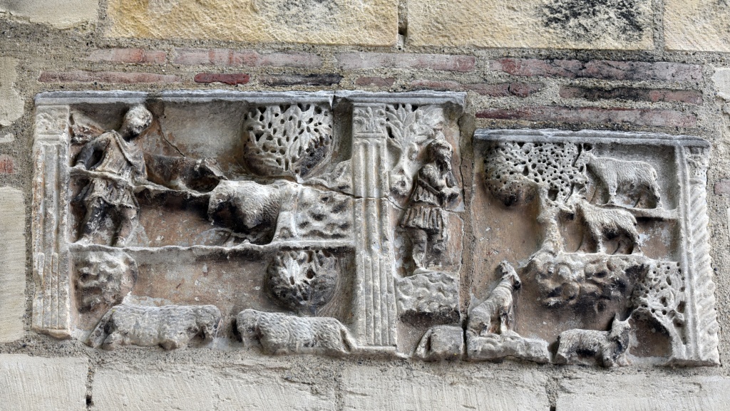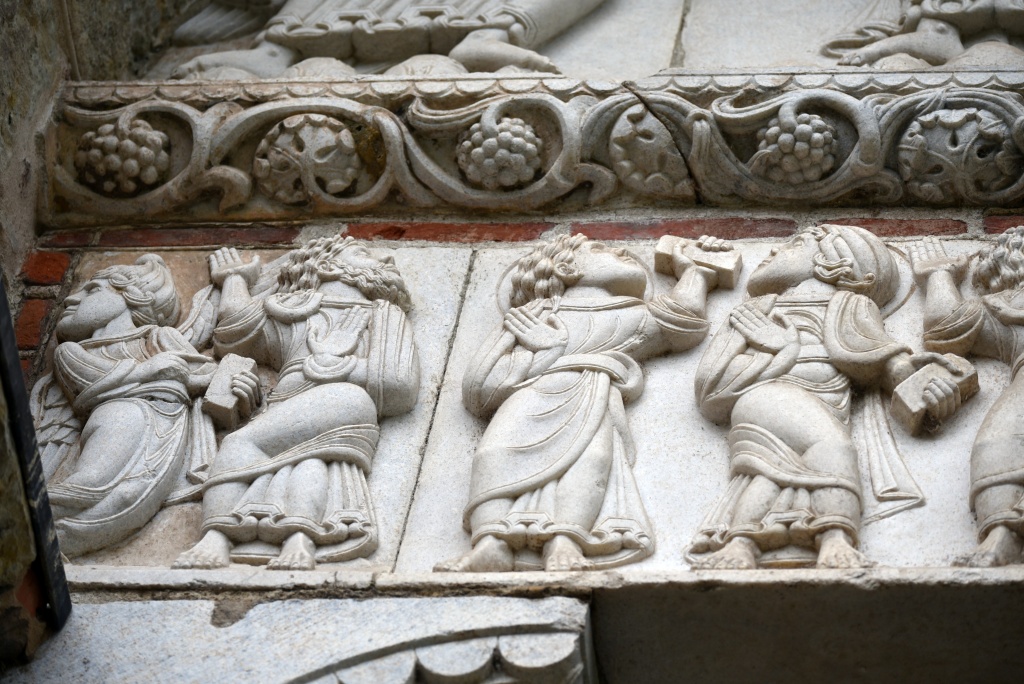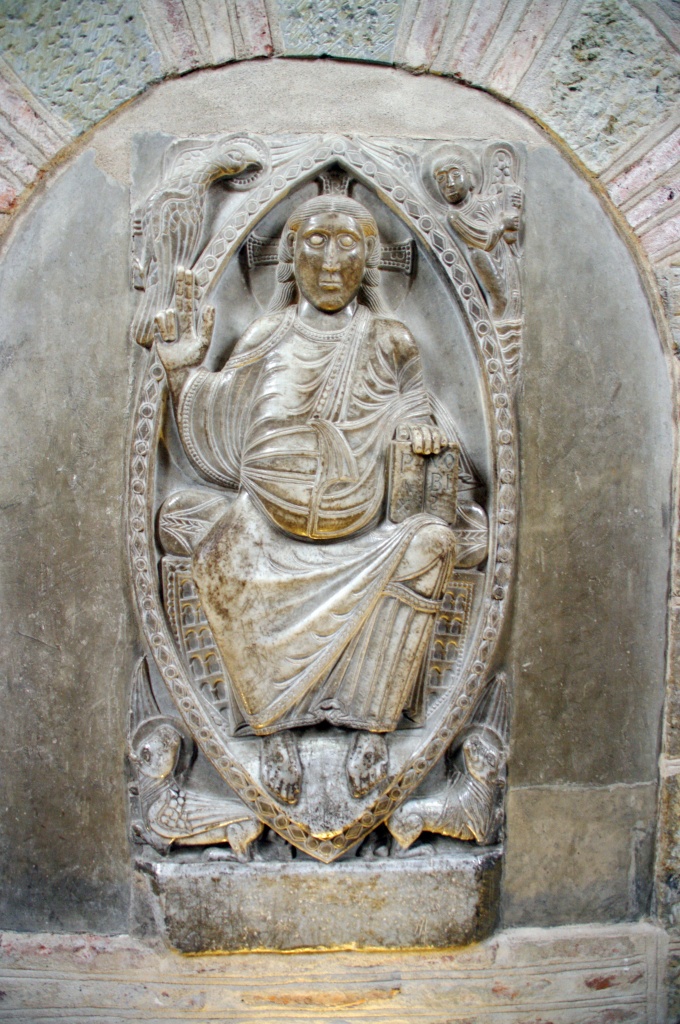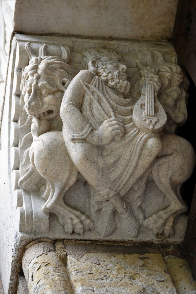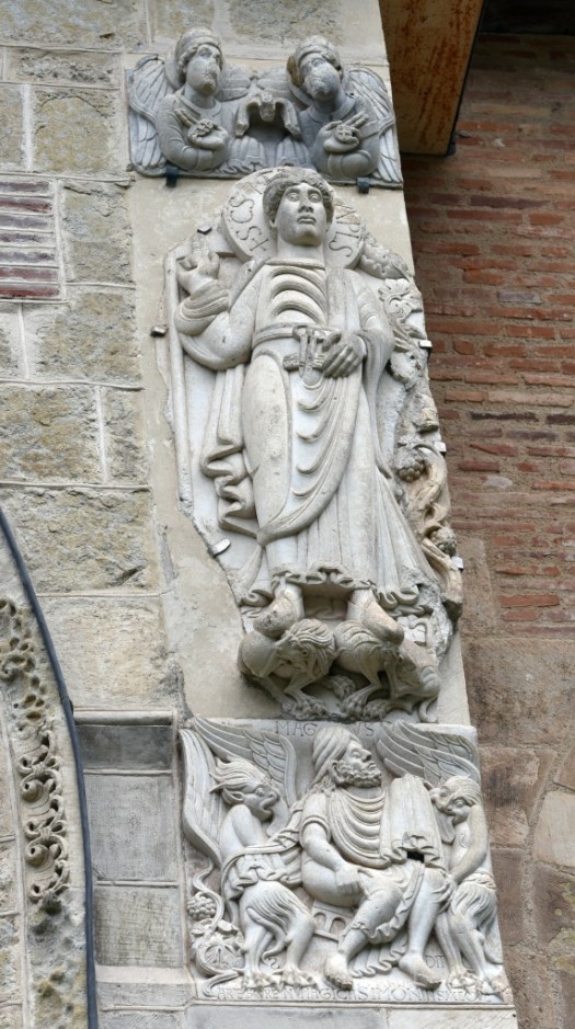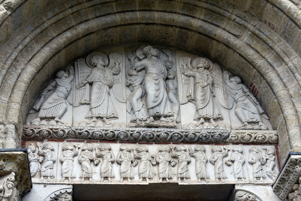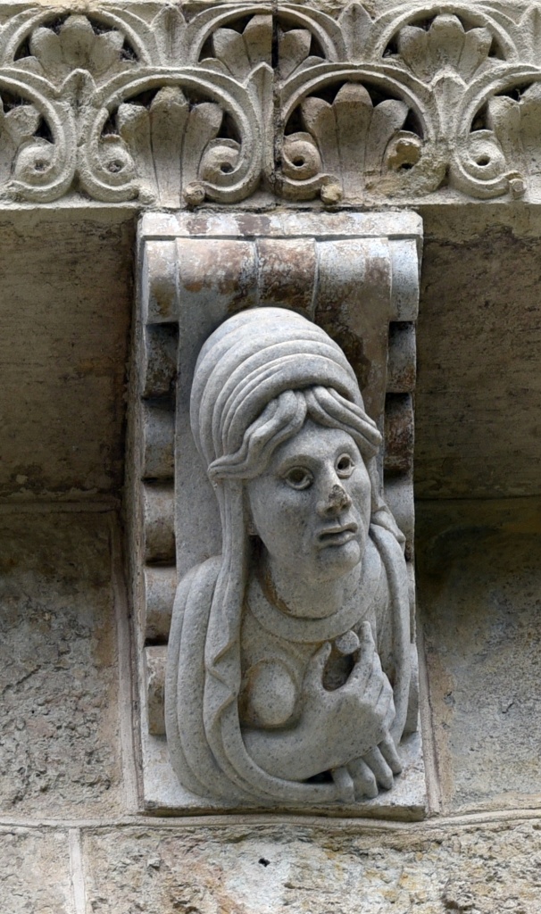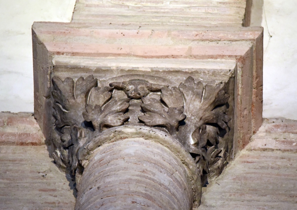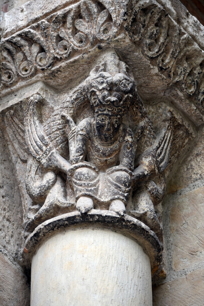 Los capiteles representan escenas bíblicas: la expulsión de Adán y Eva del paraíso, la Anunciación de San Gabriel a la Virgen María, la Visitación y la matanza de los Inocentes; dos leones y la cabeza de un tercero.
