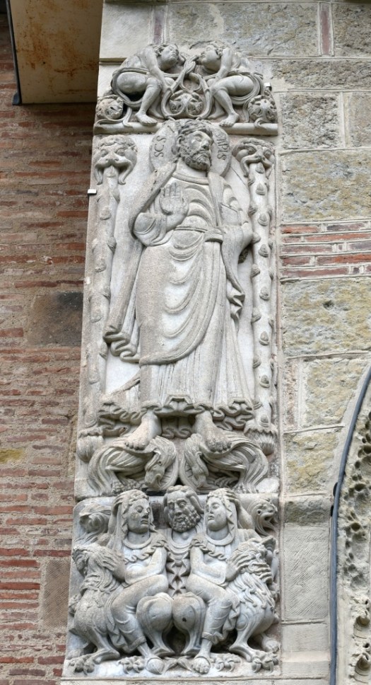 En el lado opuesto, Santiago sobre un hombre barbudo y dos mujeres sobre leones. Se interpreta como un ejemplo de amancebamiento del clero o nicolaísmo.