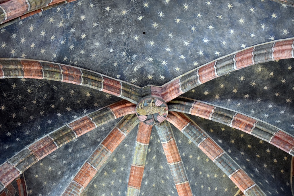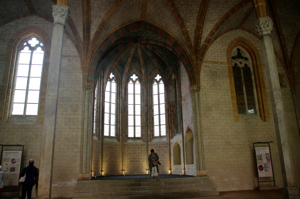 El entorno del claustro tiene una encanto especial para nosotros, aparte de por las hamacas dispuestas para contemplar el entorno tranquila y descansadamente. El primero, la sala capitular, espaciosa, con bóvedas de crucería de ladrillo sobre columnas, abierta al claustro mediante una arquería. El día que visitamos los Jacobinos ha amanecido nublado pero durante nuestra visita se abrieron un rato las nubes dejando entrar algunos rayos de sol que proporcionan al lugar un aspecto entre fantástico y misterioso. El segundo, que desde el claustro se tiene la mejor vista de la torre campanario -ya sin campana-, de planta octogonal, con 45 metros de altura.