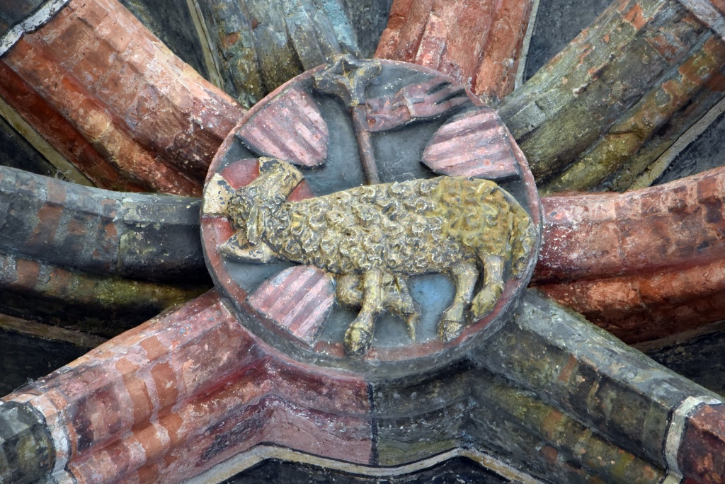 En la enjuta de la derecha se distingue a San Pedro sobre Simón el mago acuciado por los demonios, personaje que da nombre al pecado de simonía.