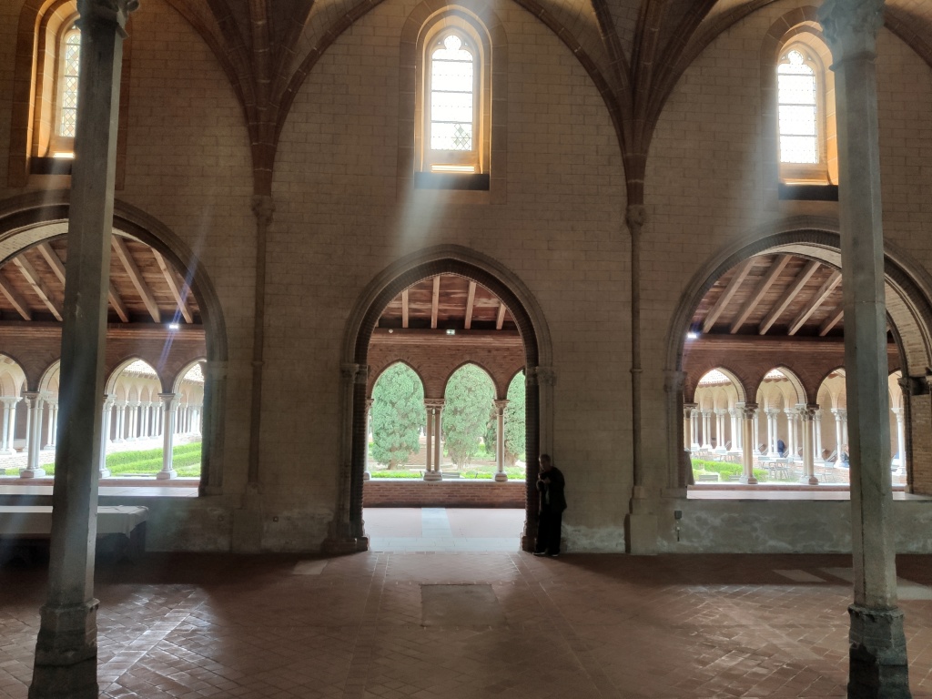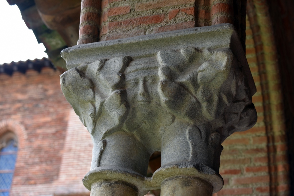 El claustro fue construido a principios del siglo XIII, después de desmantelar el anterior. Sus cuatro pandas se comunican con el patio interior mediante arquerías de arcos apuntados de ladrillo sobre columnas pareadas de fustes cilíndricos de mármol. La ornamentación de los capiteles es mayoritariamente floral, excepto unos pocos figurados. Por lo que pudimos colegir en nuestra visita, una de las tareas en los colegios tolosanos es descubrir los rostros que se esconden en estos capiteles, tarea a la que nos unimos alegremente.