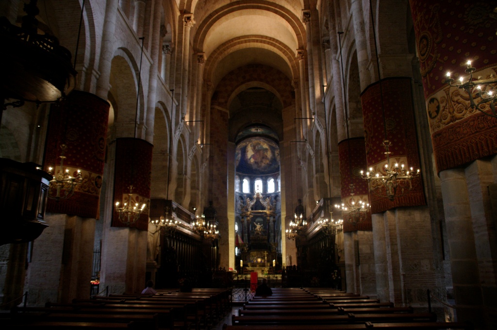 San Sernín es obra del siglo XI, prevista ya como una iglesia de peregrinaciones, de ahí sus muchas reliquias y tesoros, que atraían el interés de los peregrinos. De las cuatro iglesias situadas a mitad del Camino en territorio francés: San Martín de Tours, San Marcial de Limoges, Santa Fe de Conques y San Sernin, esta es la que posee el más antiguo de los deambulatorios, previstos para que las multitudes pudieran moverse por el interior del templo, admirar el edificio y visitar las reliquias. La iglesia es de planta de cruz latina, de cinco naves, transepto de tres naves y cimborrio alto sobre el transepto. Tiene además dos niveles o tribunas, que amplían notablemente la capacidad de la iglesia.