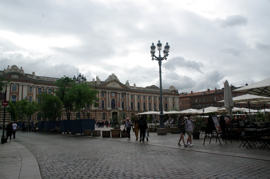 Aunque Toulouse es una ciudad grande, sus atractivos están todos en un puño. De San Sernin al Capitol hay un trecho corto y corto también del Capitol a los Jacobinos. La plaza de Capitol es grande, de líneas elegantes, flanqueada por edificios de ladrillo rosa, entre otros el ayuntamiento, el teatro y el palacio que le da nombre, que acoge el salón de los Ilustres. La mitad de la plaza está ocupada por mesas de los cafés y restaurantes, casi siempre llenos de tolosanos y de visitantes.