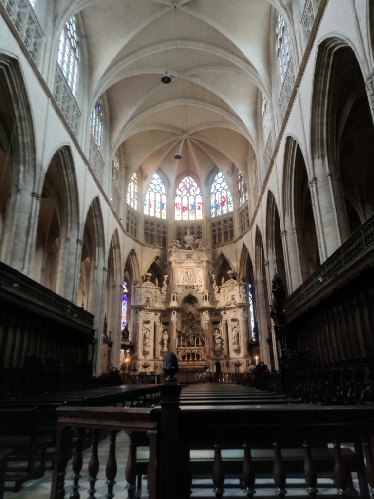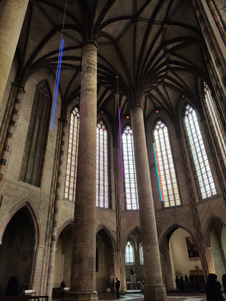 La iglesia es de planta rectangular, con dos naves separadas por siete columnas en el eje central. La cabecera es la joya de los Jacobinos de Toulouse. Por muchas veces que lo veas no dejará de sorprenderte la palmera de piedra de la cabecera, con sus veintidós nervaduras. En esta ocasión han cambiado la iluminación del templo y da más sensación de irrealidad.