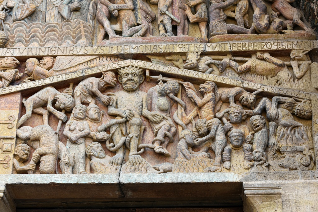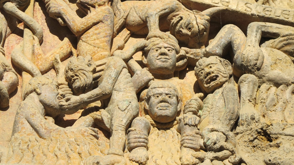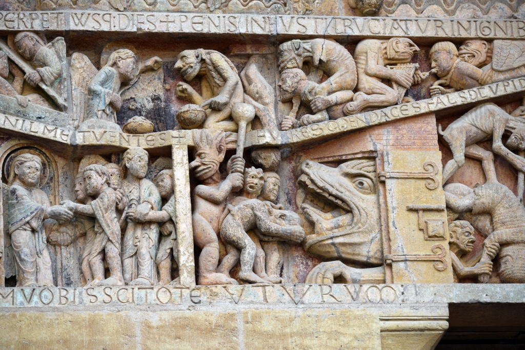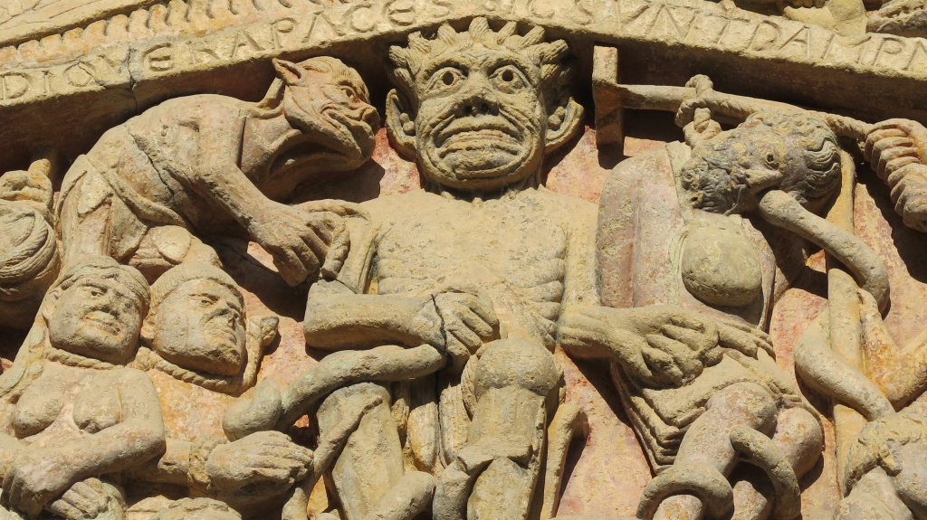 La primera comprobación de cómo han cambiado las cosas en Conques es que el aparcamiento disuasorio que se encuentra a la entrada de la población, que hace ocho años nos costó un euro, ahora vale tres. Llegamos a media mañana, dejamos el coche y nos vamos corriendo a la abadía. Desaparecido el factor sorpresa, ahora nos dedicamos a recorrer el tímpano detalle a detalle, admirando más si cabe a los extraordinarios talladores capaces de resumir en una superficie reducida el Juicio Final, los bienaventurados a la derecha de Dios, los condenados a su izquierda.