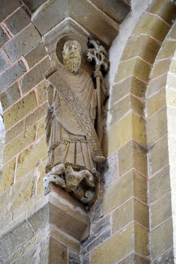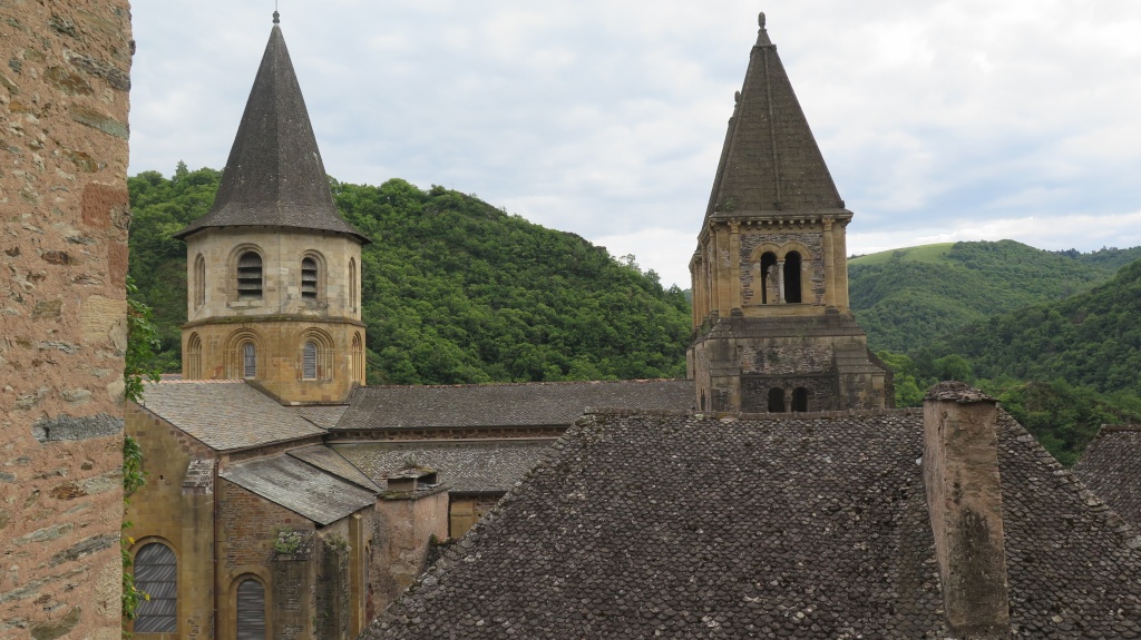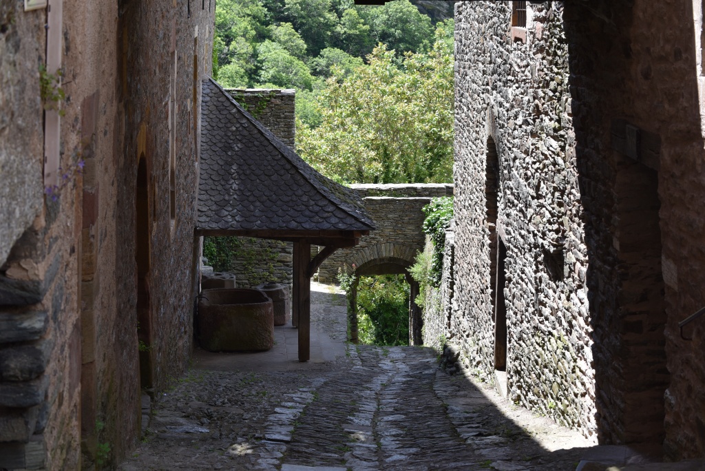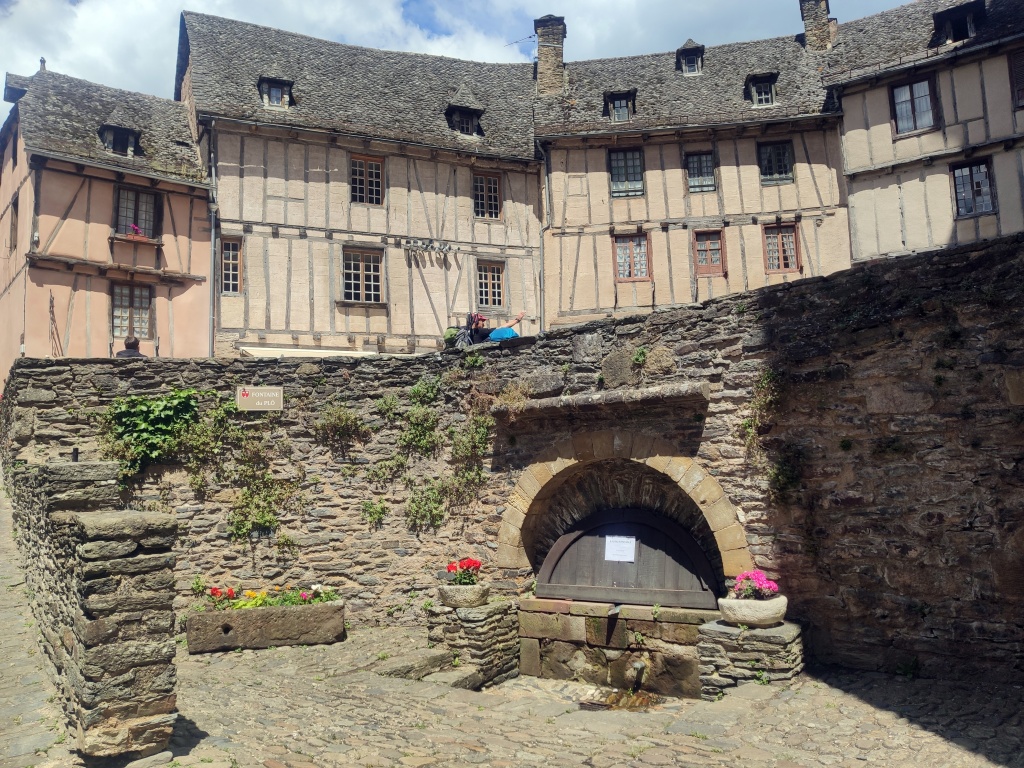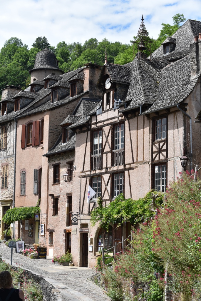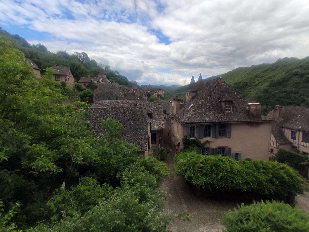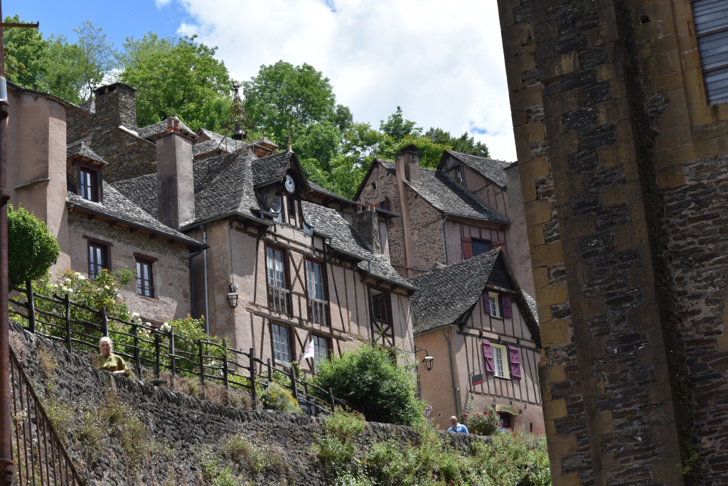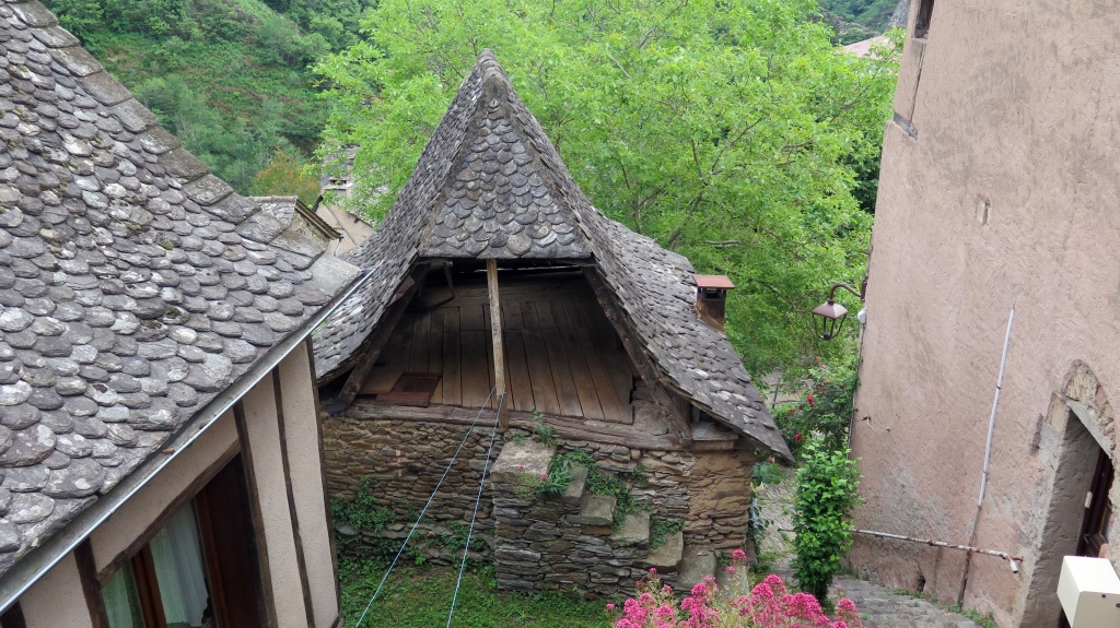 Después de esta primera visita damos un paseo por el pueblo que está cuidado y más hermoso aún de lo que recordábamos. Descubrimos que el agua de la fuente de Plô, cuyas virtudes admirables se elogiaban ya en el Liber sancti Jacobi o Código Calixtino, y que durante siglos ha dado de beber a miles de peregrinos, actualmente no es potable. En el tejado de una casa vemos un secador de castañas -secadou-, producto tradicional en la comarca. También comprobamos que ha cerrado el restaurante Sainte Foy, donde antaño el Colega comió la famosa vaca aubriac que, ocho años después, aún recuerda. Buscamos la alternativa y la encontramos en el restaurante Charlemagne donde nos ofrecen la carne de la región en una terraza con vistas al valle que nos proporciona la sensación de estar en el lado de los bienaventurados del tímpano de la abadía. Ya puestos, en la tienda frente a la iglesia compro un rascador de madera, habida cuenta el buen resultado del que compré en la visita anterior.