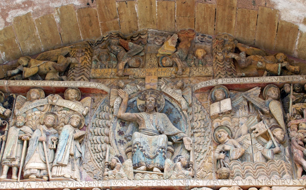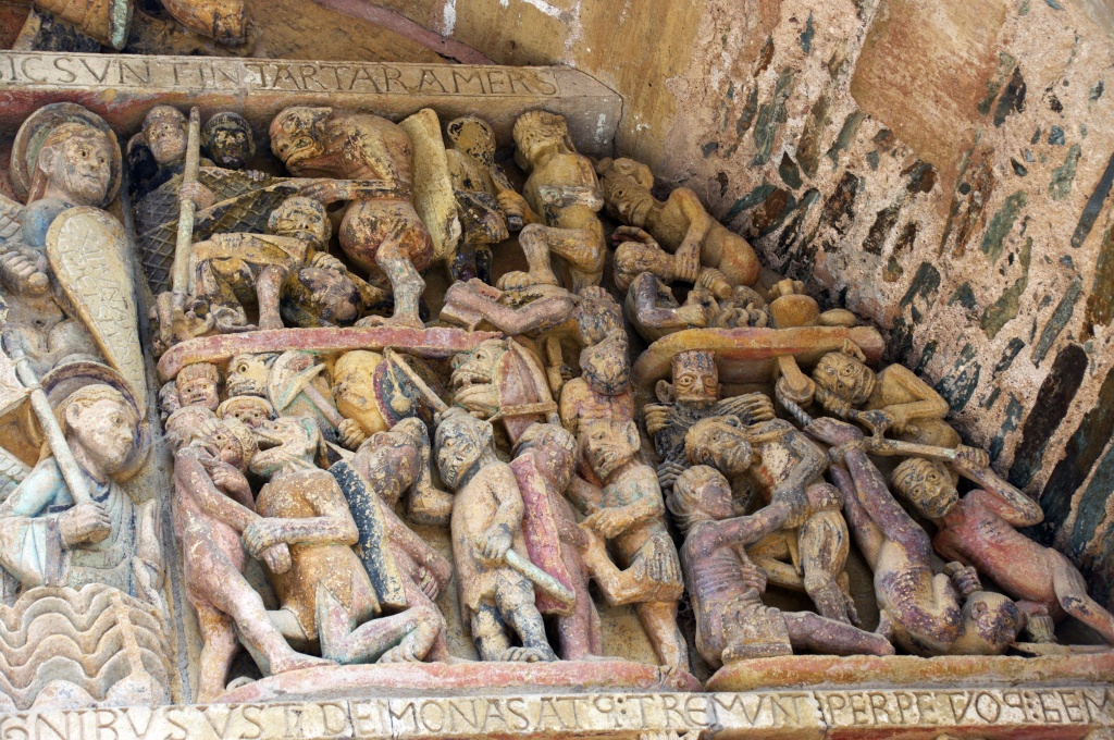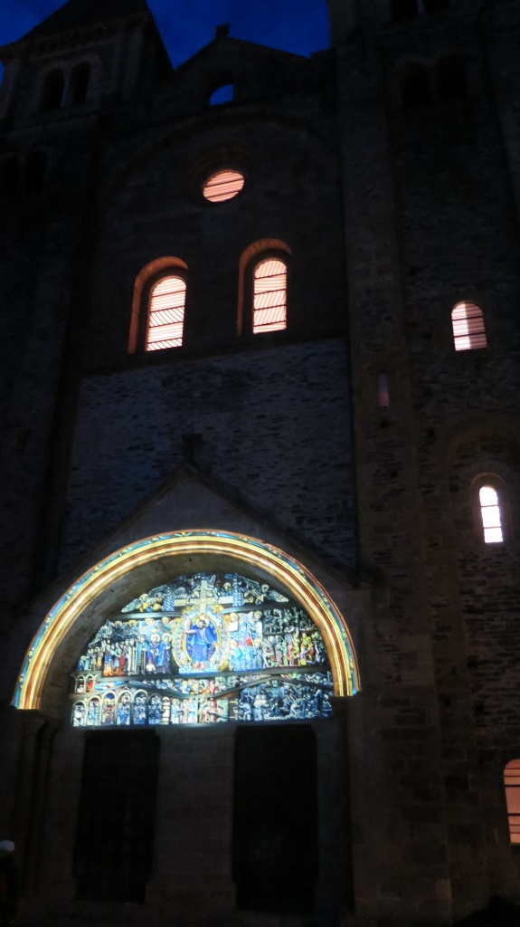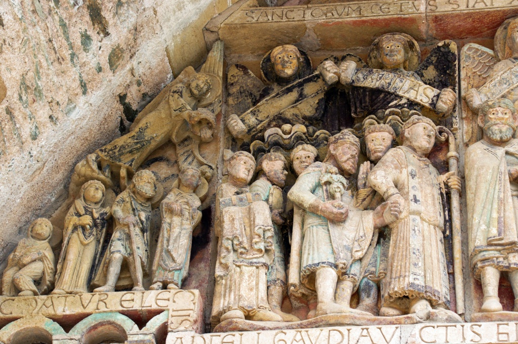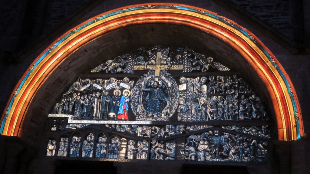 Finalmente, salimos a la calle donde nos espera la última sorpresa. El tímpano aparece iluminado con la policromía que se supone tuvo originariamente. La luz juega sobre las imágenes, destacando escenas, jugando con las figuras esculpidas.