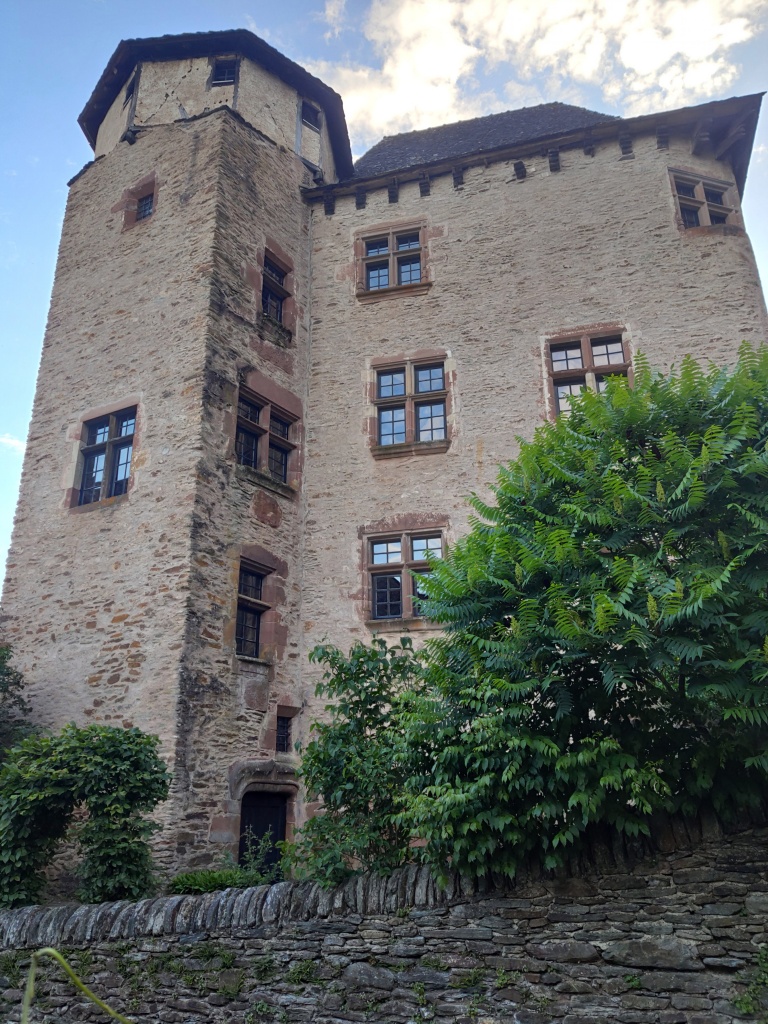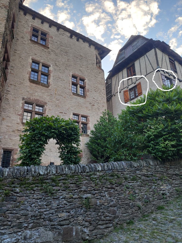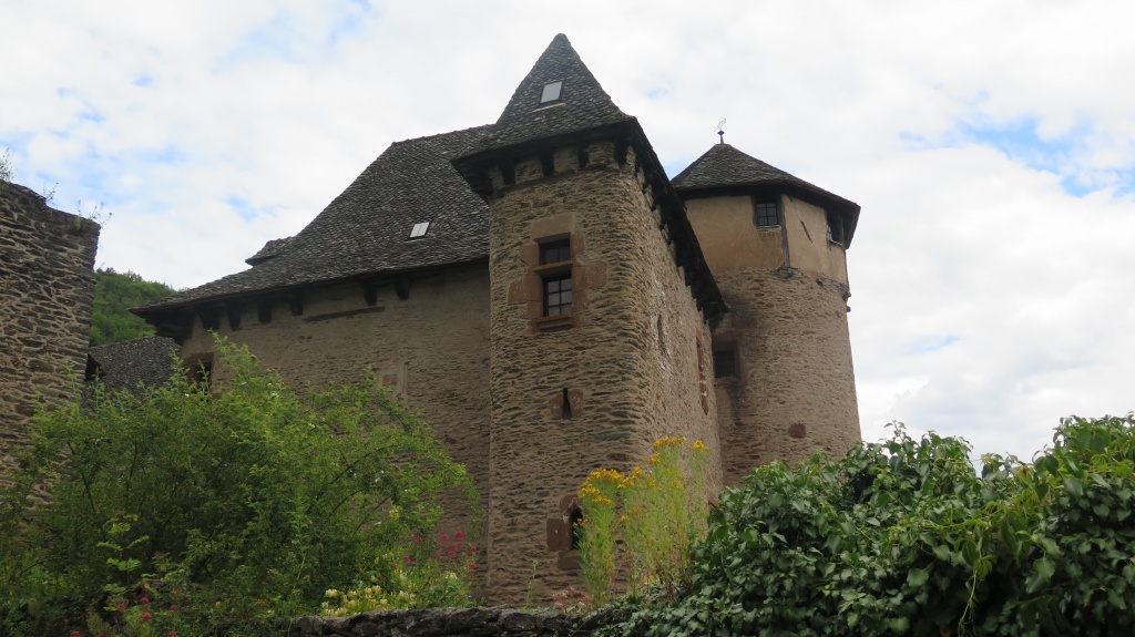 El hotel que hemos reservado -La Conquise- se encuentra en la parte superior del pueblo. Hay que advertir que en Conques la oferta hotelera es escasa y dirigida, principalmente, a los peregrinos. Como el tráfico está prohibido en todo el recinto urbano, para llegar hemos de dar un rodeo por los alrededores pero, finalmente, encontramos un aparcamiento junto a la puerta de la Vinzelle, al lado del castillo y de nuestro alojamiento, que resulta ser un lugar encantador, con unas vistas maravillosas. Si viviera el señor del castillo podríamos compartir la sal por las ventanas, así de cerca lo tenemos.