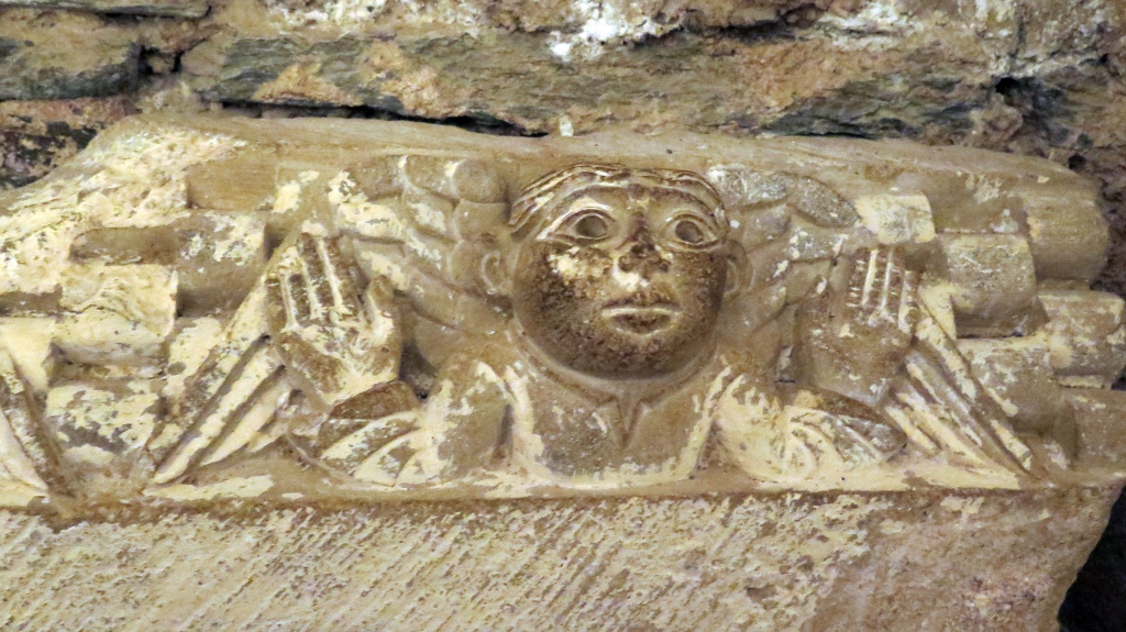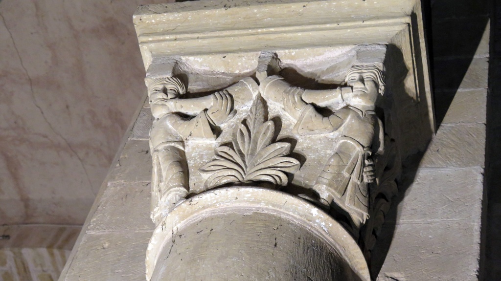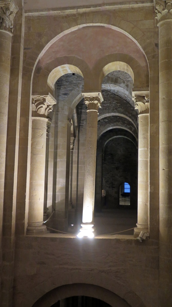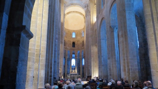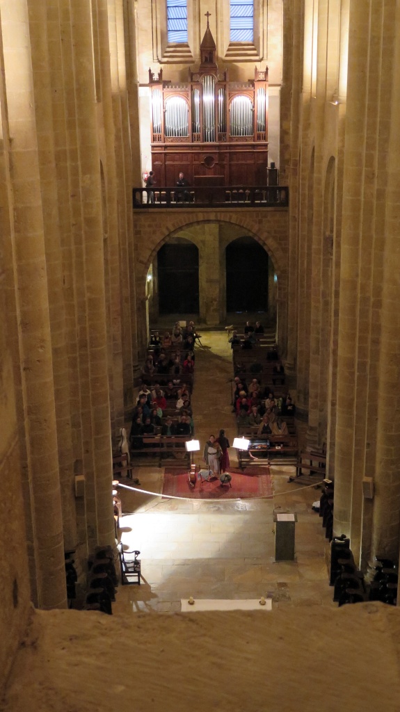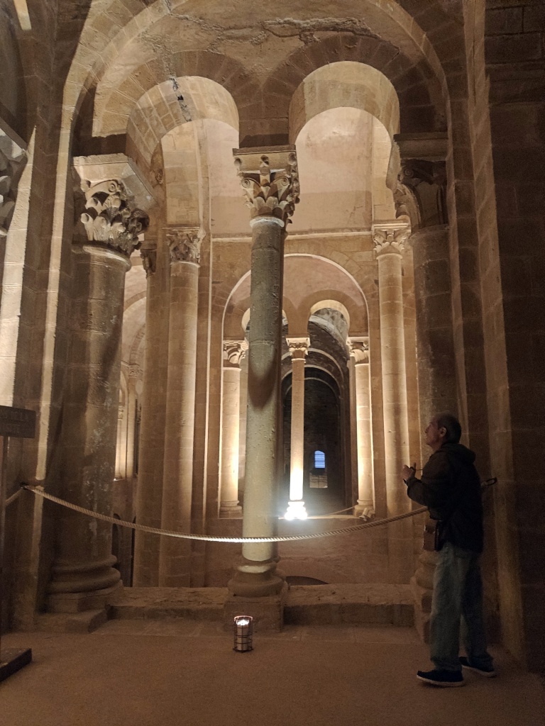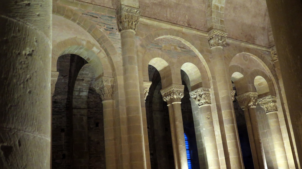 Más aún cuando abren la puerta de las tribunas (previo pago de 6 euros). Pasear por las alturas de la abadía teniendo como fondo sonoro la música popular del Aveyron es una experiencia emocionante. Las figuras y los capiteles adquieren una apariencia diferente, una especie de vibración a la luz de los focos. Hemos traído solo la cámara pequeña -una Canon G16- con la que el Colega no para de disparar, quizá para constatar luego que no lo hemos soñado.