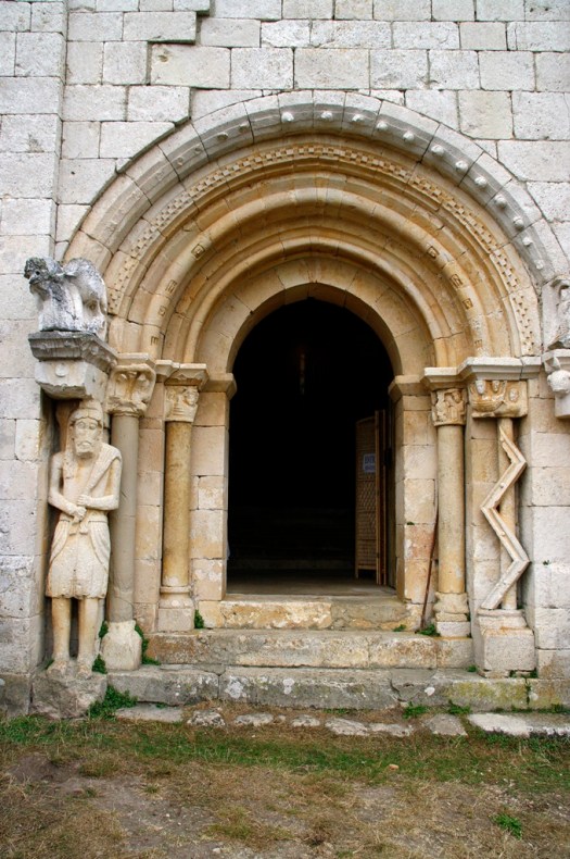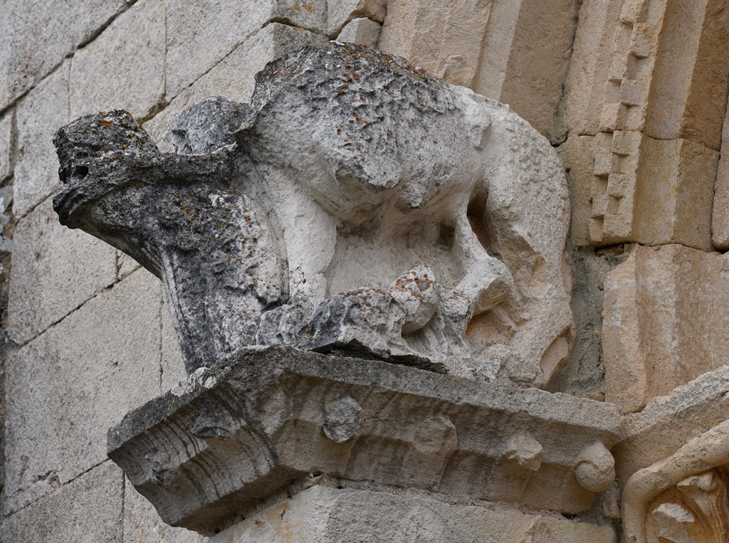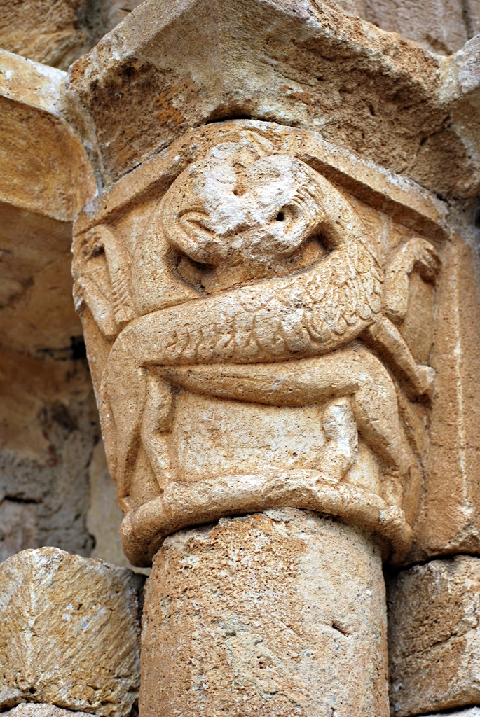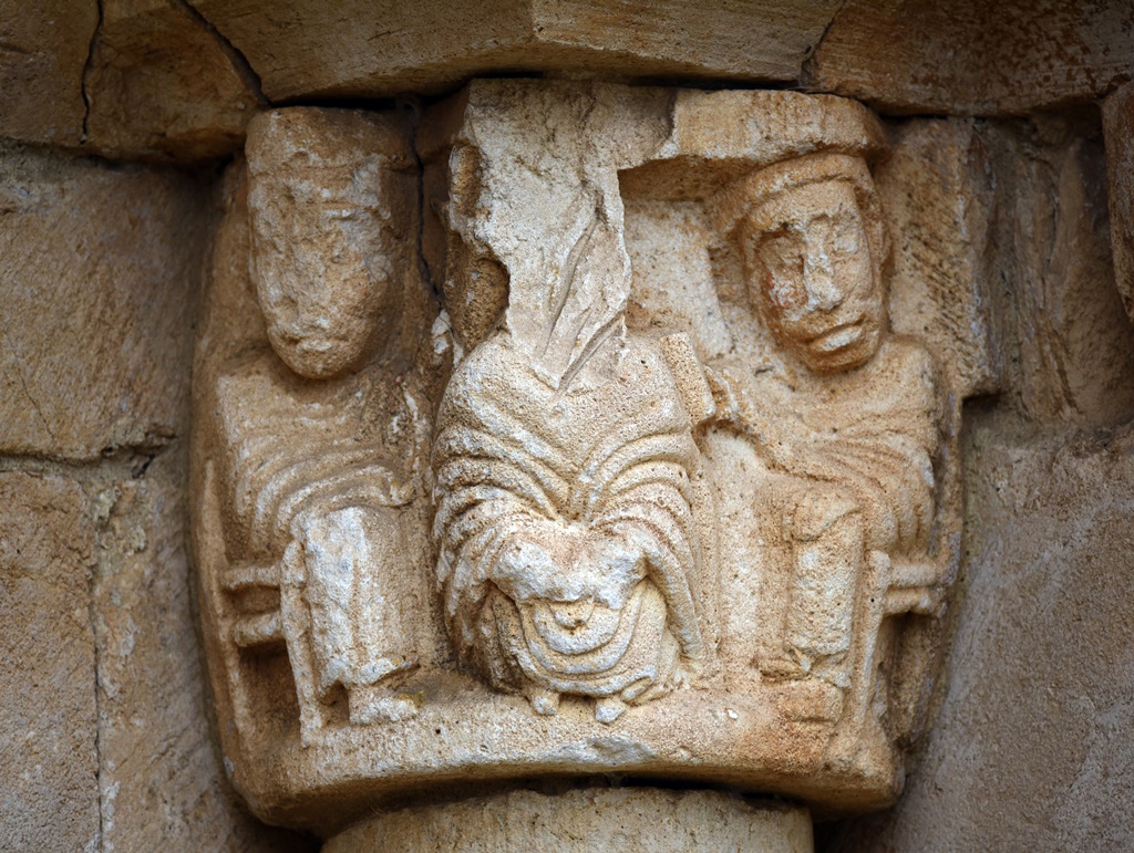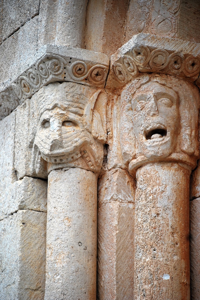 Los capiteles que rematan las columnas en las que apean las arquivoltas de esta puerta representan las formas de martirio que sufrió San Pantaleón, finalmente decapitado.