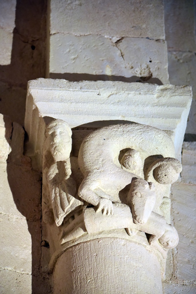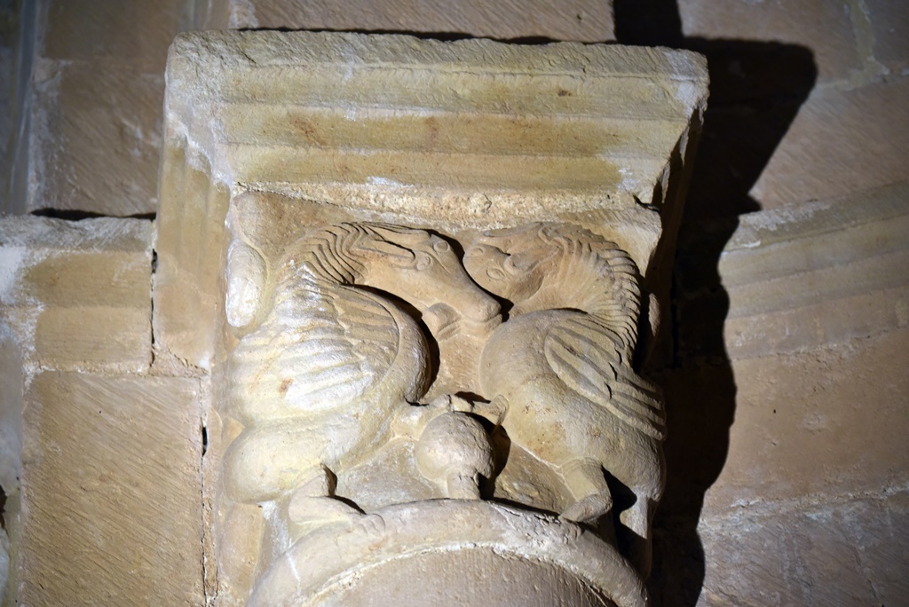 Entre los capiteles del interior hay dos que muestran a una enorme serpiente mordiendo a un humano, que escenificarían el milagro vivido por el santo al conseguir la resurrección del niño por intercesión divina, lo que condujo a su conversión. También hay una pareja de dragones y el relieve de un gato, animal que se identifica con el mal.
