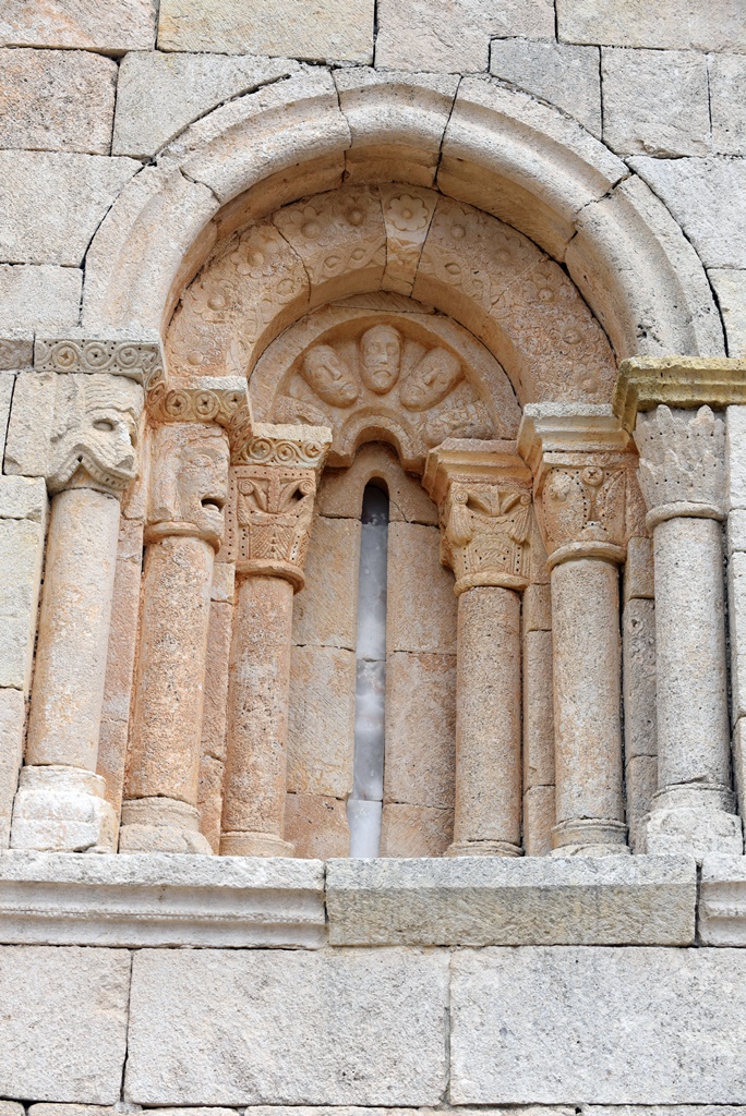 En las ventanas exteriores se repiten los motivos vegetales junto a una abundancia de rostros y cabezas similares a las que se encuentran en el monasterio de Estíbaliz y un gluton comiéndose el fuste, motivo frecuente en el románico francés.