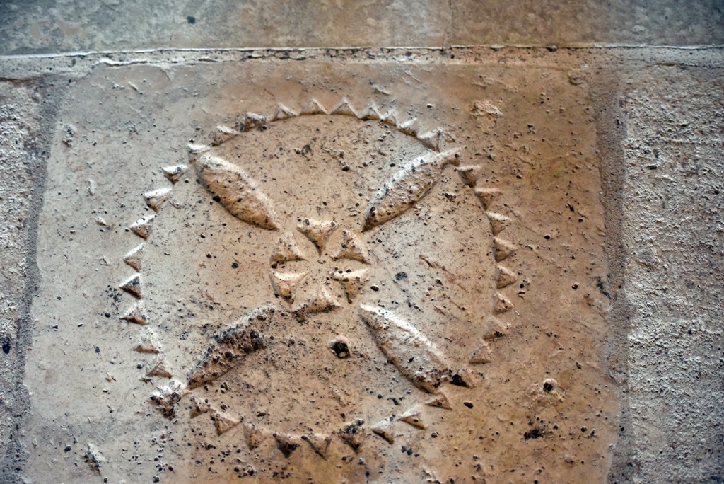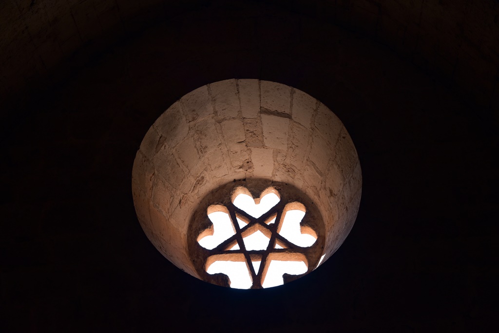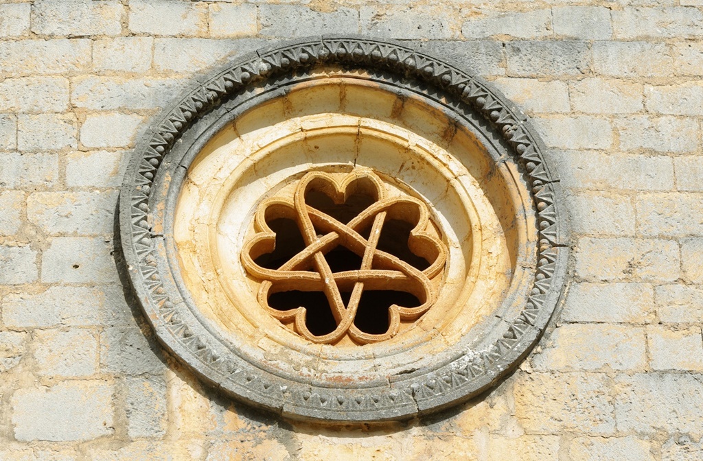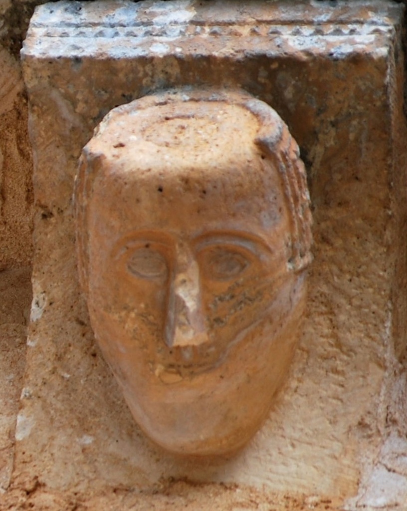 Conviene ayudarse por un buen objetivo -o unos prismáticos- para distinguir los canecillos que se distribuyen por la portada y el ábside. Junto a motivos habituales en el románico -cabezas humanas, pareja de luchadores, un músico itifálico, Adán, el crismón- aparecen otros de simbología más oculta: el sol y la luna, cuatro cabezas formando cruz, la pata de oca, la letra H, que evoca al constructor del templo de Jerusalén-.