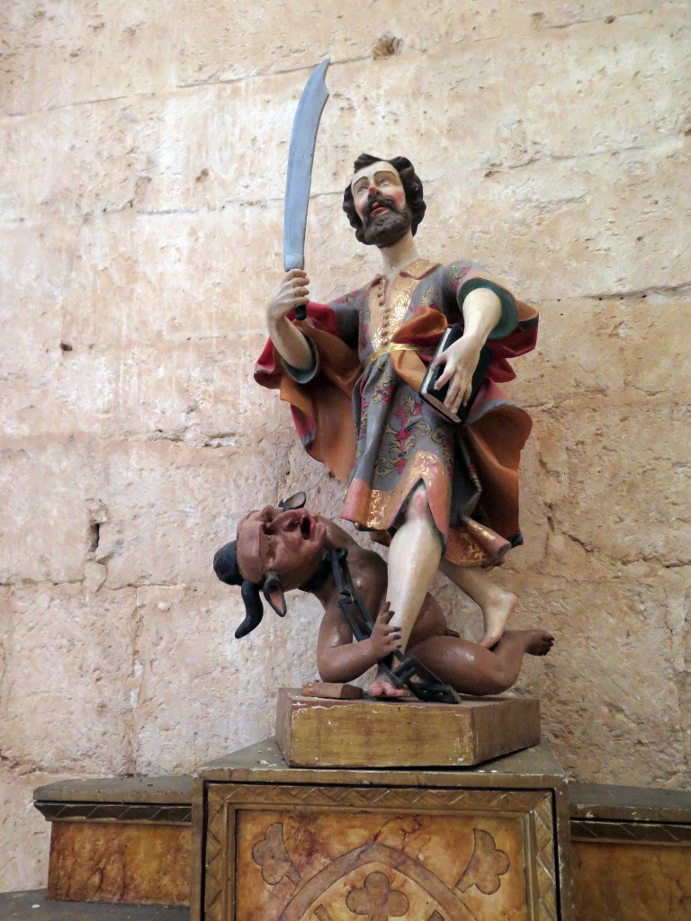 En nuestra visita de agosto, la mayoría de visitantes brujulea alrededor de la iglesia, dudando si entrar o seguir el paseo. Delante de nosotros una familia se dispone a entrar. La entrada cuesta un euro, poco más que el precio del folletito que entregan al visitante. El marido dice que él no paga eso, que prefiere esperar a la mujer fuera. Él se lo pierde.