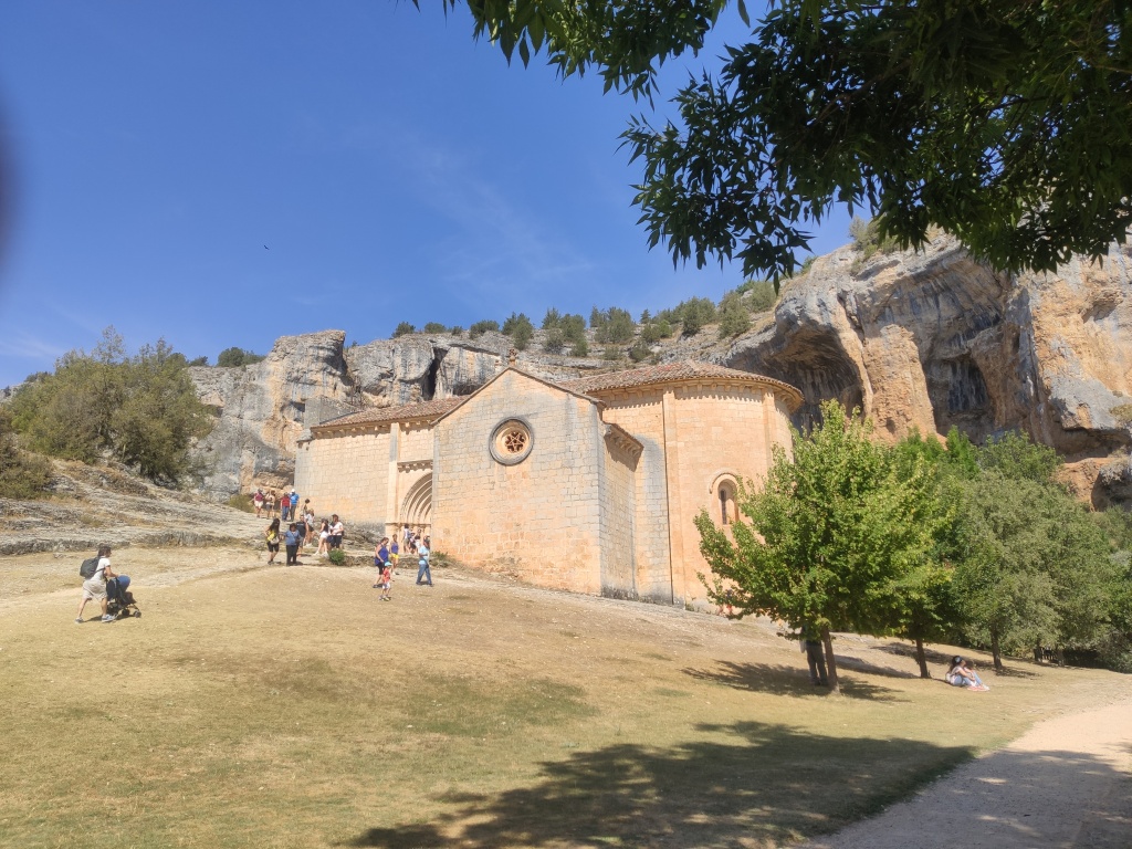 Desistimos de pasear por los senderos y nos dirigimos directamente a la ermita de San Bartolomé, que es nuestro objetivo. Queremos aprovechar que ahora permanece abierta durante buena parte del año para conocer su interior. La iglesia está ubicada en un meandro del río Lobos, cobijada por enormes crestones de piedra, que aumentan la impresión de monumentalidad de un lugar sobre el que pesan mitos y leyendas para todos los gustos.