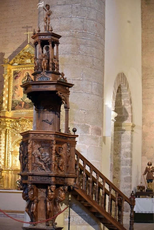 La iglesia se levanta entre 1504 y 1540. Realiza el retablo mayor fray Juan de Rizzi, que pinta la famosa batalla de Hacinas, la Asunción de la Virgen y otros seis lienzos. Destaca la rejería, obra de Sebastián de Medina (1676) y el púlpito, decorado con relieves de los evangelistas, obra de la escuela de Berruguete, realizada en una única pieza de nogal.