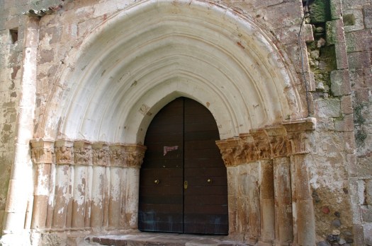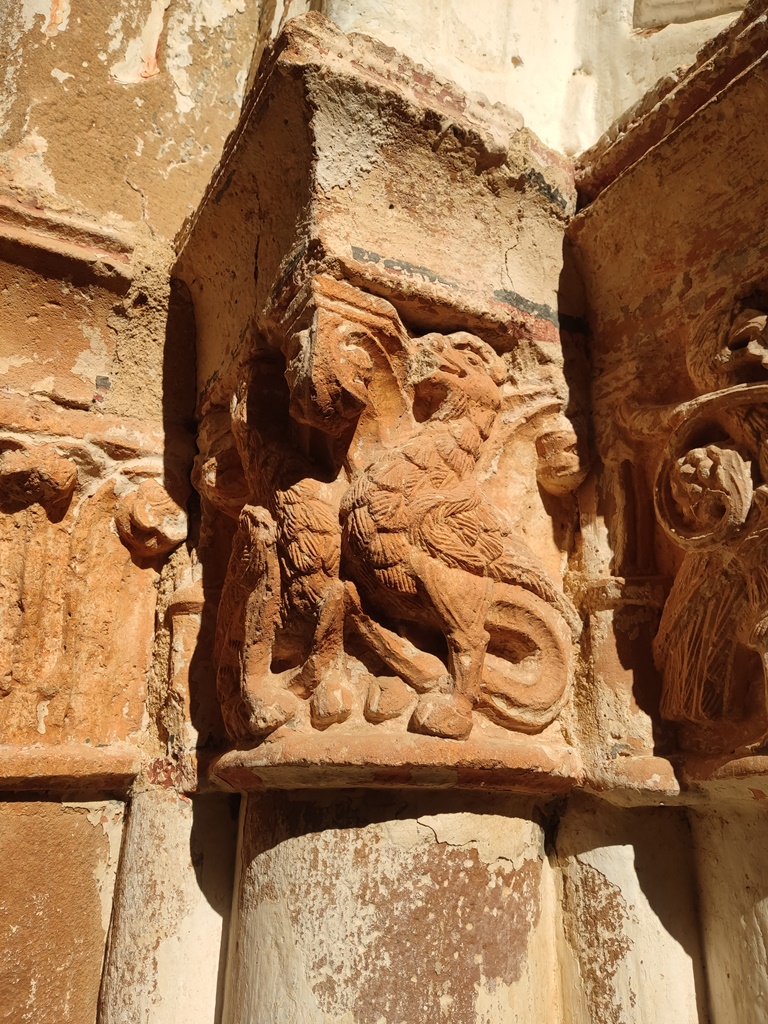 Esta portada románica es de arco medio punto con cinco arquivoltas que apean sobre una docena de capiteles. Metemos los objetivos de las cámaras a través de la reja -los jubilados solemos andar escasos de vista- y, pese al enjalbegado, constatamos la belleza de esos capiteles en los que se distinguen arpías, grifos, dragones, leones devorando a un animal, animales picoteando sus patas, así como una pareja de guerreros armados con escudos y una Anunciación, todo ello con un claro aire silense.
