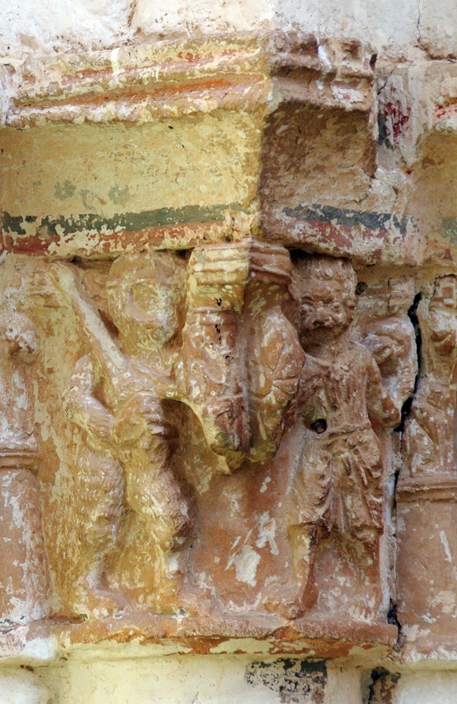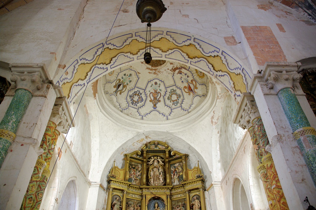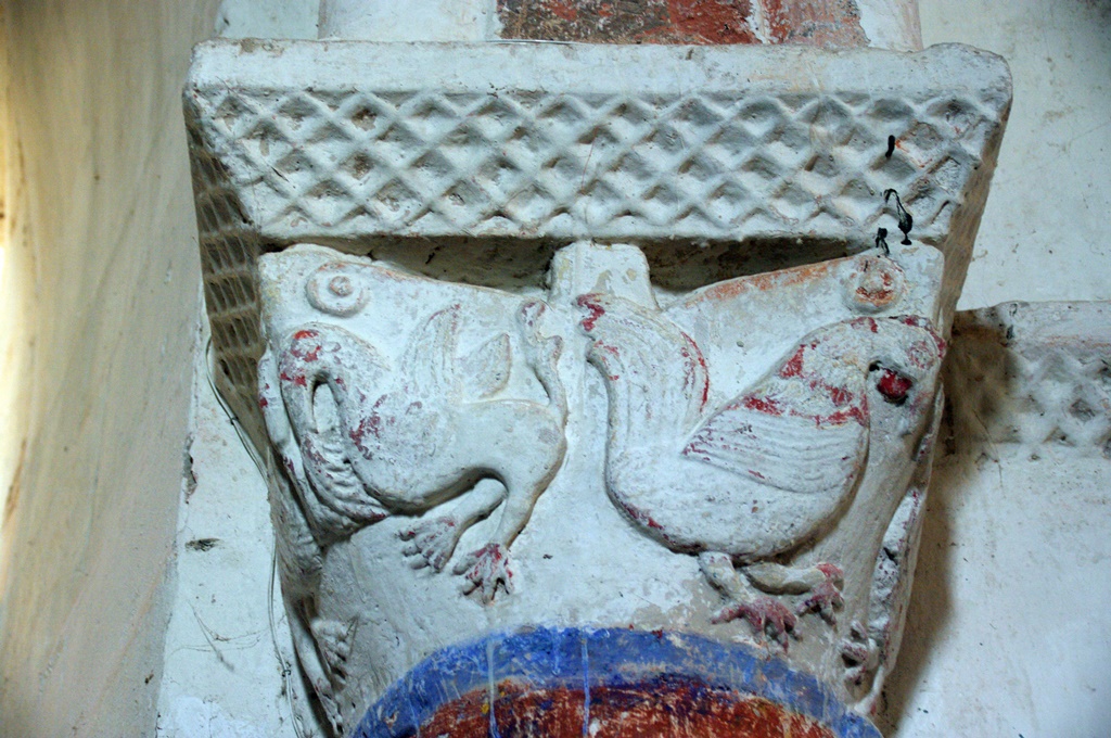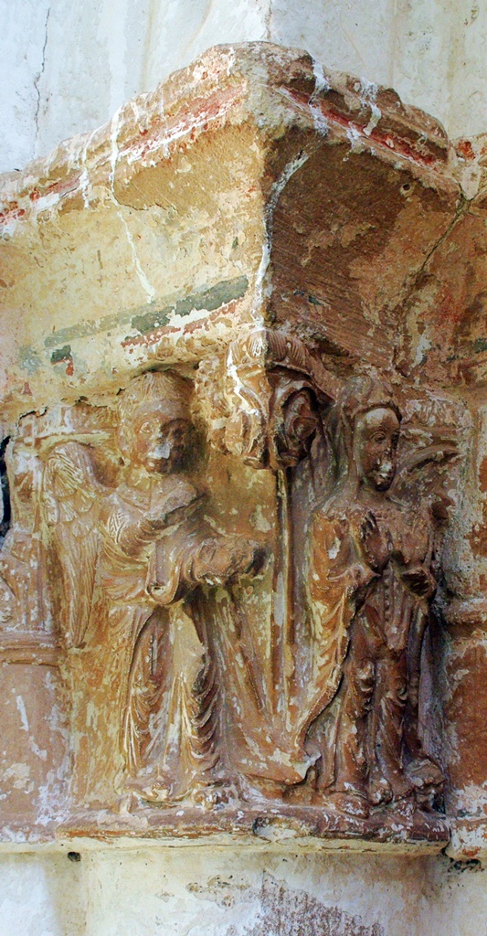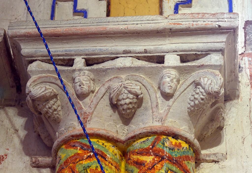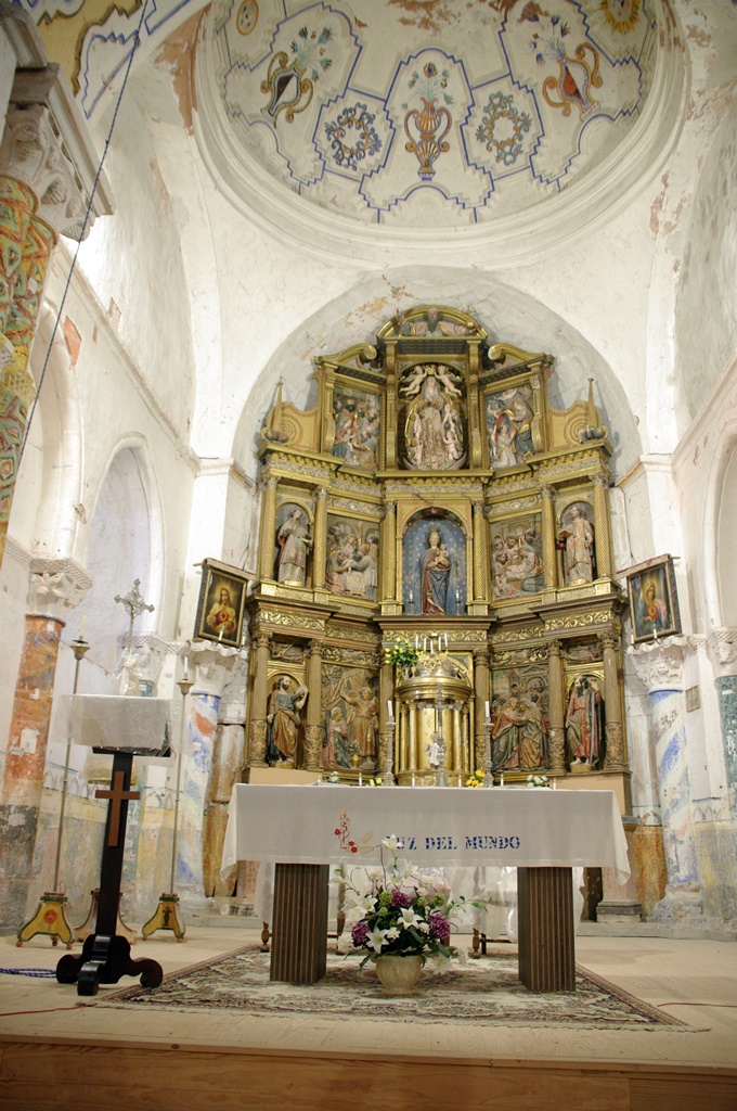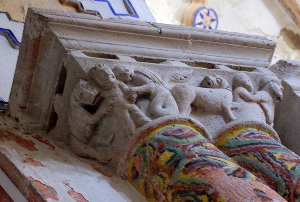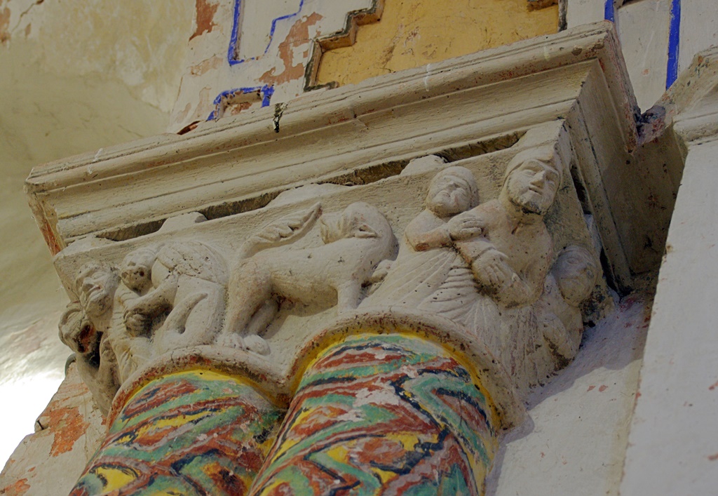 En algún momento de su historia, la iglesia fue totalmente enjalbegada, cubriendo la policromía que parece atisbarse en alguno de los capiteles.