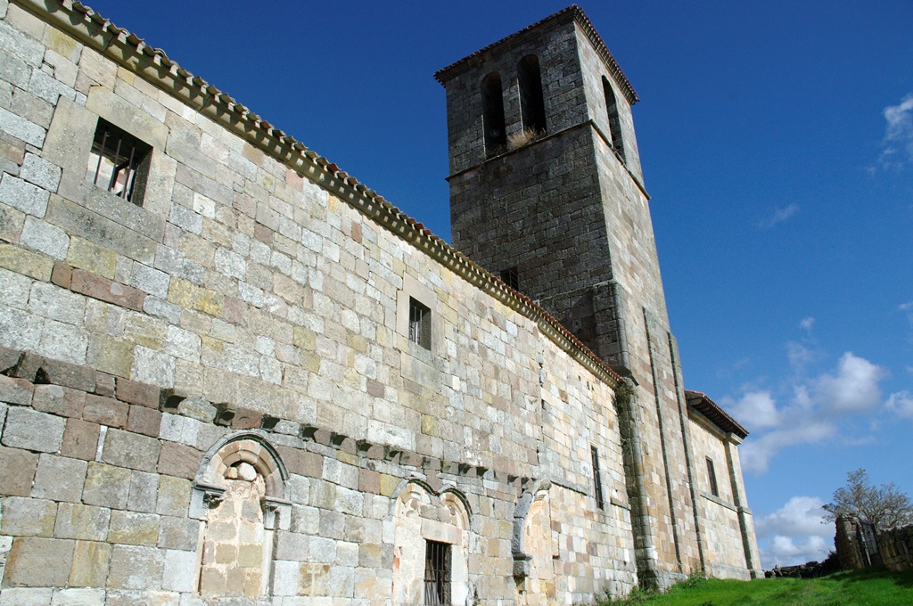 Félix Palomero Aragón e Irene Palomero Ilardia, autores de un estudio arqueológico del templo, concluyeron que hubo una primitiva construcción, de la que solo queda parte de uno de sus muros. En una segunda etapa se construyó una iglesia de tres naves de la que permanece en pie la caja de los muros. Todavía en estilo románico se realiza el ábside con triple cabecera. A finales del siglo XII se abren las portadas occidental y meridional y en el XIII se adosa una galería porticada a estas fachadas.
