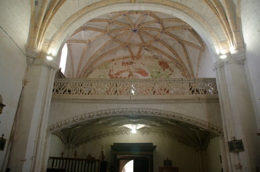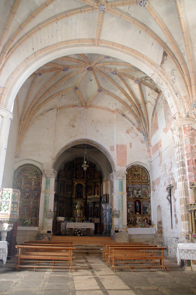 La nave se cubre con bóvedas estrelladas y remata con un coro alto tardogótico levantado sobre arco escarzano y cubierto con crucería flamígera.