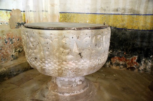 Bajo el coro se encuentra una pila bautismal también románica de copa semiesférica y basa circular.