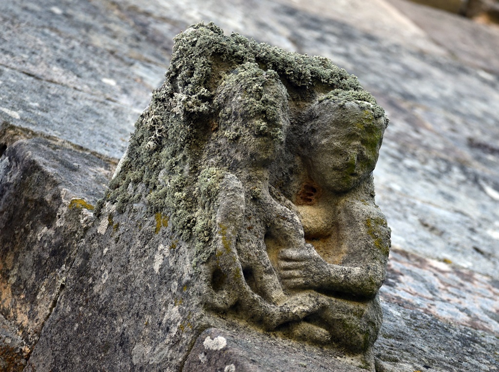 El muro sur presenta los restos de una probable galería desaparecida, algunos canecillos algo deteriorados, entre los que se distingue una pareja abrazada.