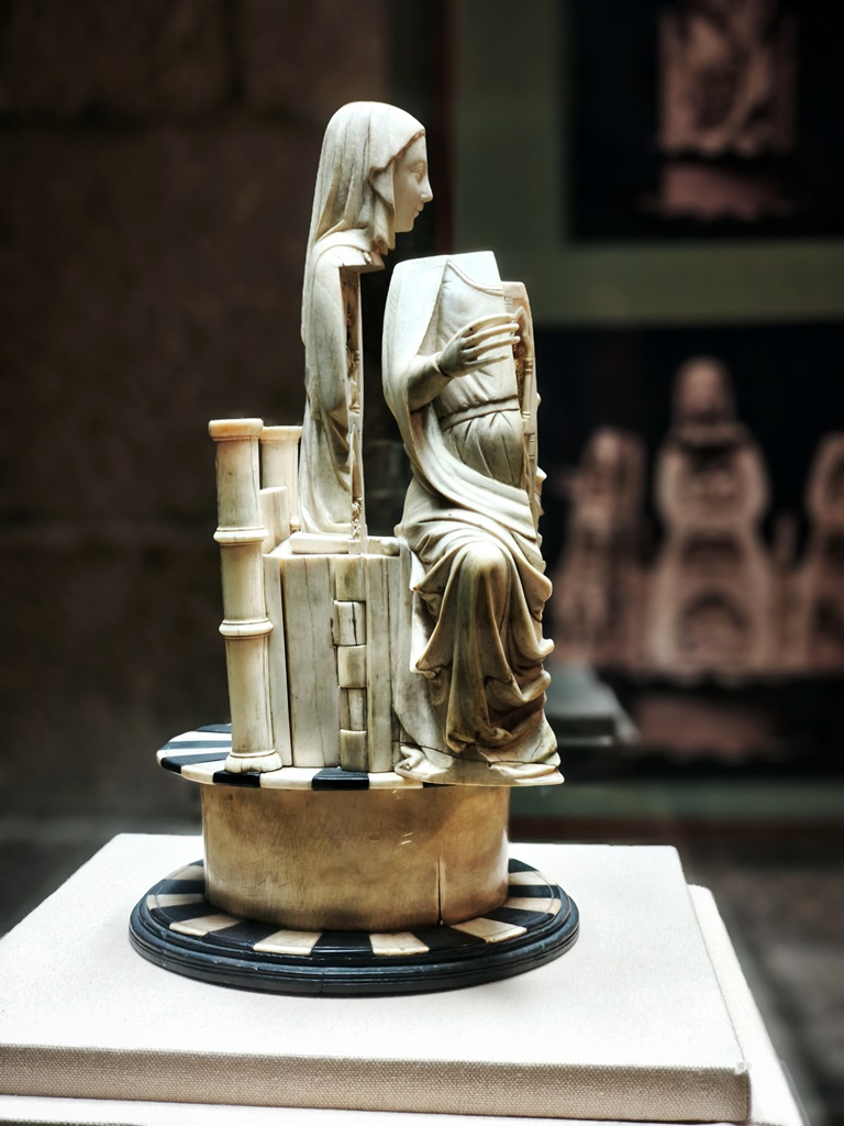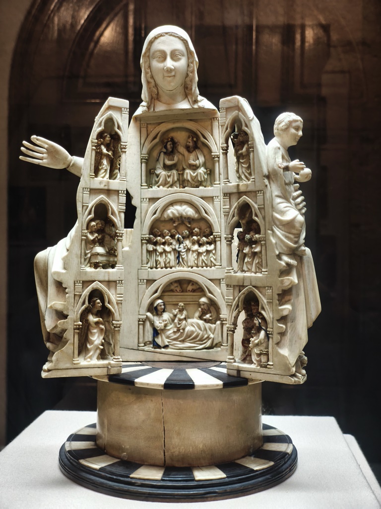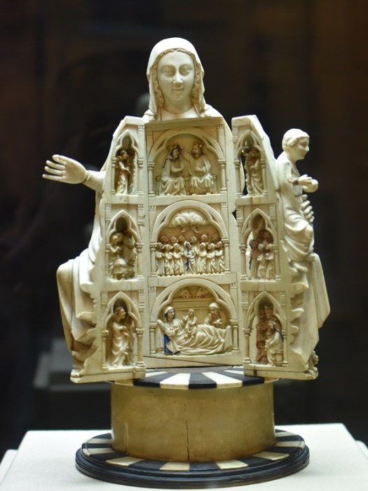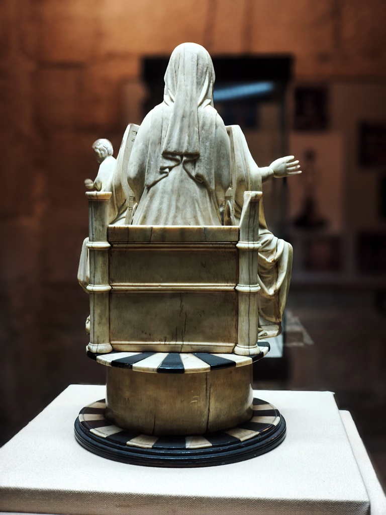 La Virgen es una talla de marfil de 25 cm. Cerrada es una imagen sedente con el niño Jesús sobre su rodilla sostenido por su brazo y mano derecha, del tipo Sedes Sapientiae. En la mano derecha, algo levantada, probablemente portaba una flor; el pie derecho pisa un animal, dragón o león. Viste túnica ceñida y lleva velo, el rostro sonríe ligeramente, con una expresión tan delicada que -aunque no seáis una moñas como yo- emociona. El Niño ofrece el gesto de bendecir y en la mano izquierda porta una bola, símbolo del poder.