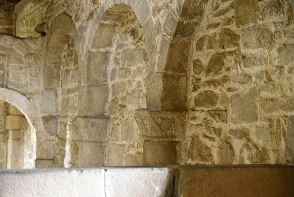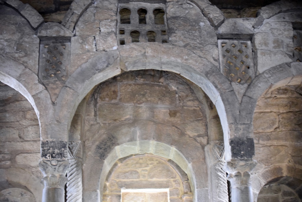 Llama la atención la arquería transversal tras el último tramo de la nave, a la manera de iconostasio, que separa el presbiterio y el altar del resto de la nave, destinado a los fieles. La arquería consta de tres arcos de medio punto sobre columnas de mármol y capiteles de tipo clásico. Estamos ante una estructura única en las construcciones medievales hispanas, relacionadas lejanamente con las arquerías de la mezquita de Córdoba o con la iglesia mozárabe de San Miguel de Escalada (León).